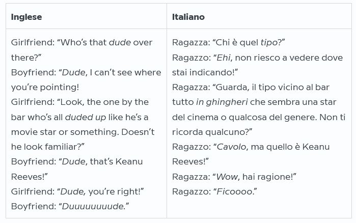 Il termine Dude ha un numero così vasto di significati, soprattutto se usato come interiezione, che è possibile mantenere intere conversazioni con quest’unica parola, ecco un esempio:
