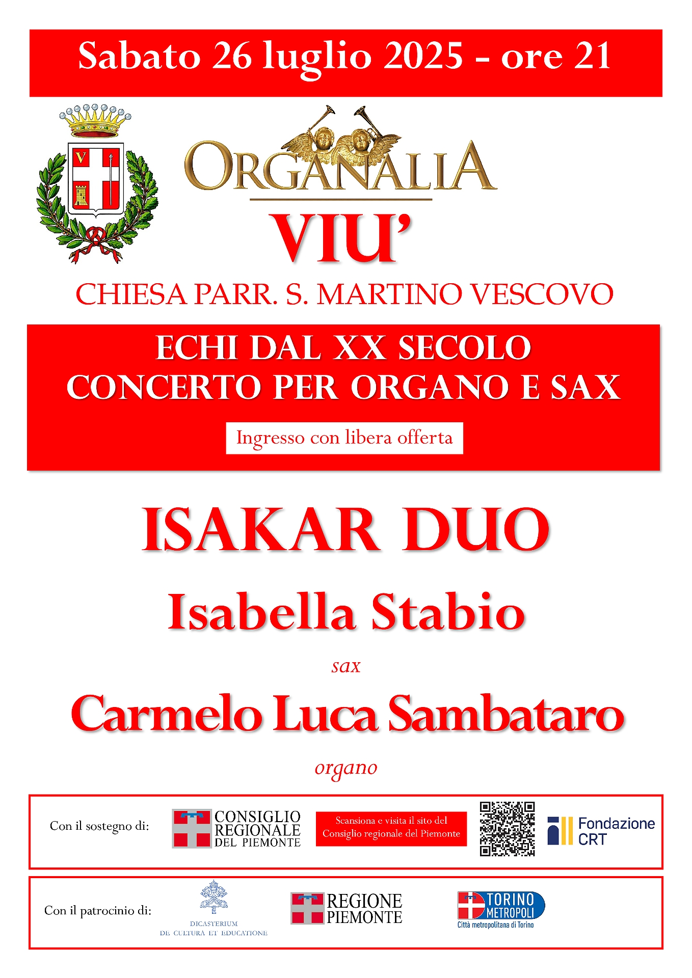 Il penultimo concerto si terrà sabato 26 luglio alle 21 nella chiesa parrocchiale di San Martino vescovo a Viù, dove protagonista sarà l’Isakar Duo, formazione composta dalla sassofonista Isabella Stabio e dall’organista Carmelo Luca Sambataro. Coppia nella vita e sul palco, i due musicisti proporranno un programma interamente novecentesco, che spazia dalle atmosfere sinfoniche di Alfred Hollins a brani dello stesso Sambataro, passando per pagine di Hans Uwe Hielscher, David Salleras, Enrico Pasini, Marco Enrico Bossi e Hans-André Stamm, con incursioni nel mondo sonoro di Giuseppe Donati e persino una composizione di Henry-Louis de La Grange, celebre musicologo ma anche autore di rarità musicali.