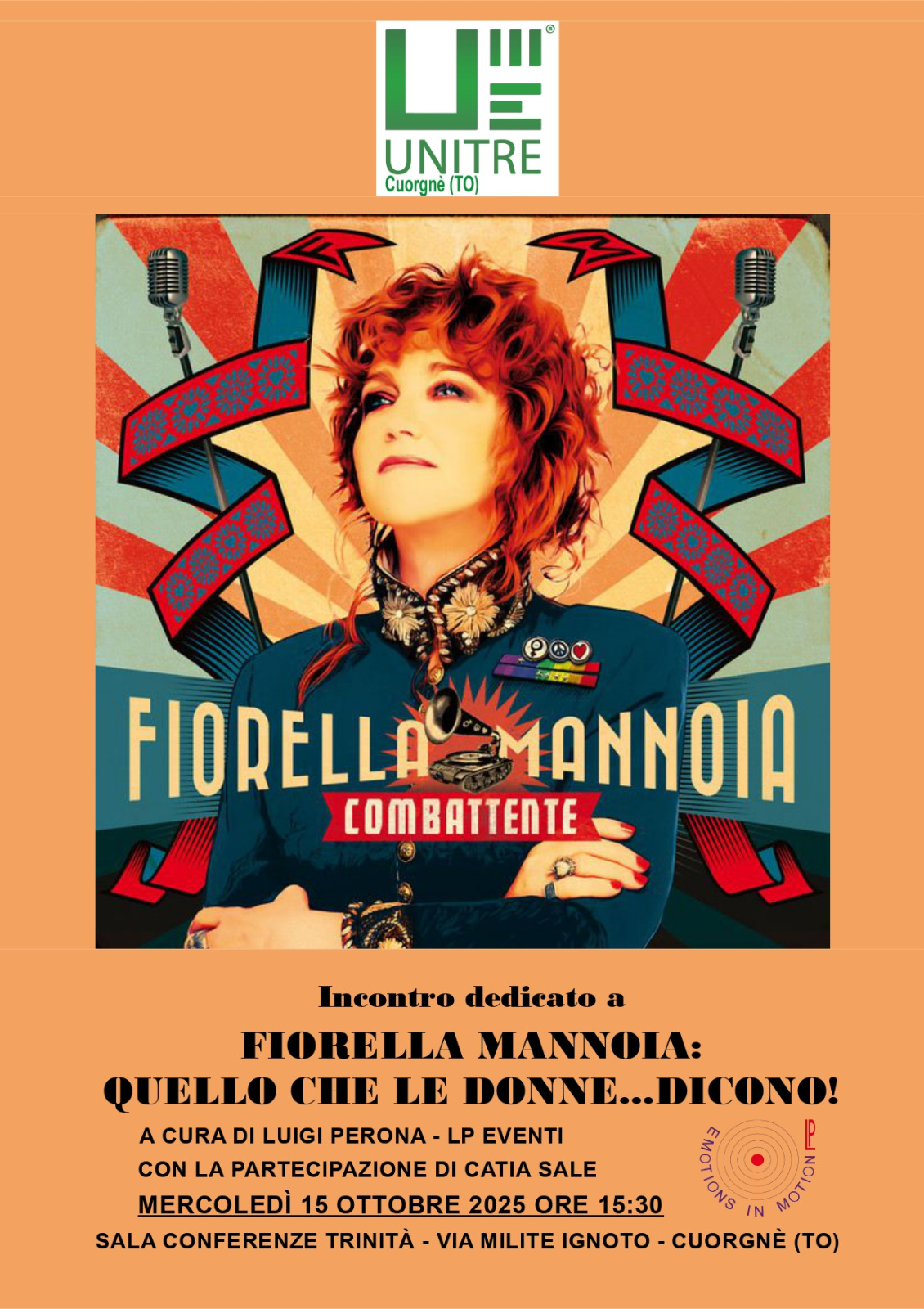 Mercoledì 15 ottobre, alle 15.30, la Sala Conferenze della Trinità di Cuorgnè (in via Milite Ignoto) ospiterà un nuovo appuntamento del ciclo di conferenze dell’UNITRE’ di Cuorgnè. Protagonista del pomeriggio sarà Fiorella Mannoia, raccontata dal professor Luigi Perona con la partecipazione di Catia Sale, in un incontro dal titolo eloquente: “Fiorella Mannoia: quello che le donne… dicono!”.
