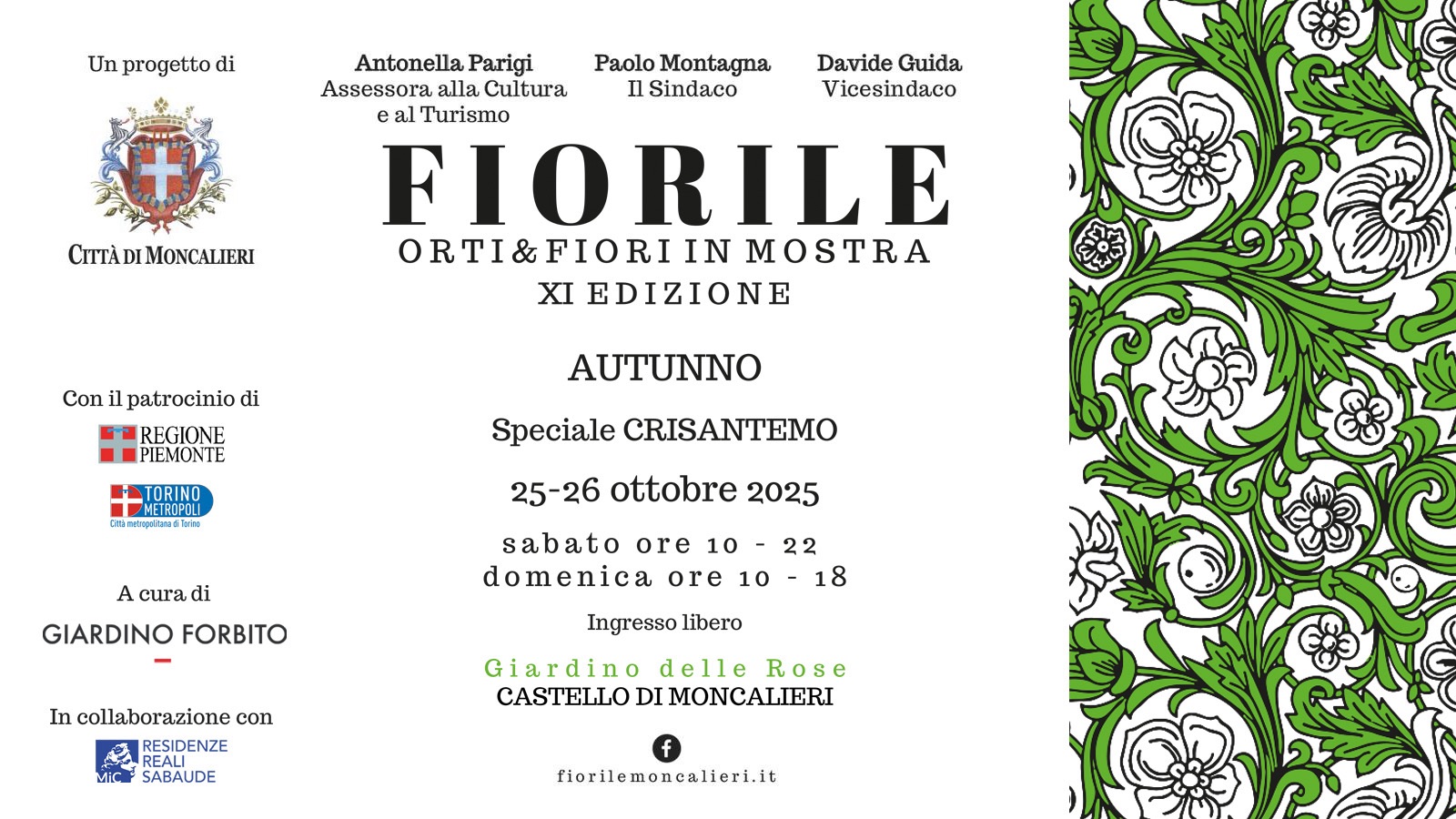 Il Castello Reale di Moncalieri si prepara a trasformarsi, nell’ultimo fine settimana di ottobre, in un giardino d’autunno che profuma di storia e rinascita. Torna infatti “Fiorile – Orti & Fiori in mostra”, la manifestazione culturale e vivaistica patrocinata dalla Città metropolitana di Torino, che da anni racconta il mondo del verde in tutte le sue forme. L’appuntamento, ospitato come di consueto nel Giardino delle Rose del Castello, riporta tra le sue aiuole il dialogo tra arte, natura e cultura, con un’edizione autunnale che celebra il Crisantemo, fiore simbolo di vita, luce e memoria.