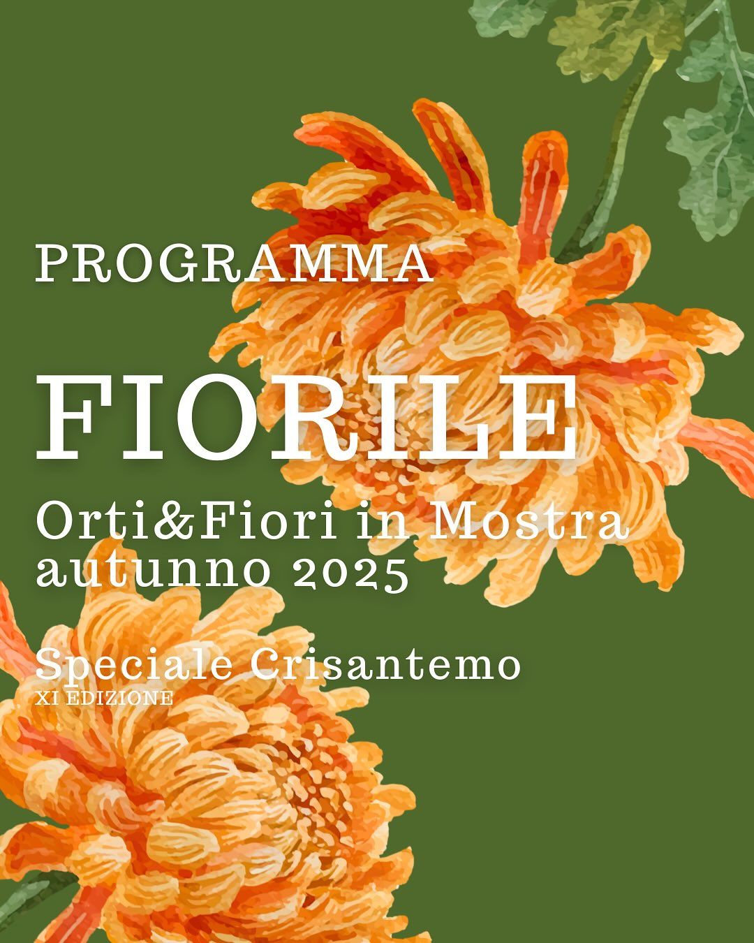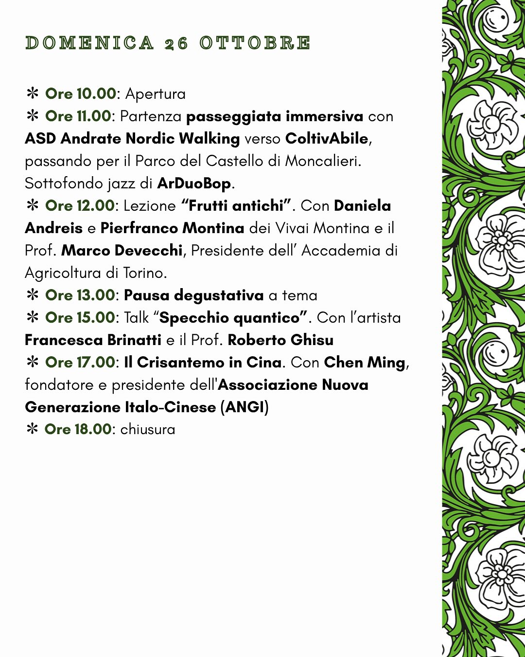 Il programma prevede appuntamenti che spaziano dal giardinaggio all’orticoltura, dall’artigianato alla biodiversità, fino a momenti di approfondimento e lettura. Tra i più attesi, la lezione di padre Enzo Bianchi, fondatore della Comunità di Bose, dedicata al Crisantemo come simbolo di vita e morte, luce e buio, e l’intervento di Chen Ming, presidente dell’Associazione Nuova Generazione Italo-Cinese (ANGI), che guiderà un viaggio nella cultura del crisantemo in Cina, tra significati spirituali e usi ornamentali, farmaceutici e culinari.