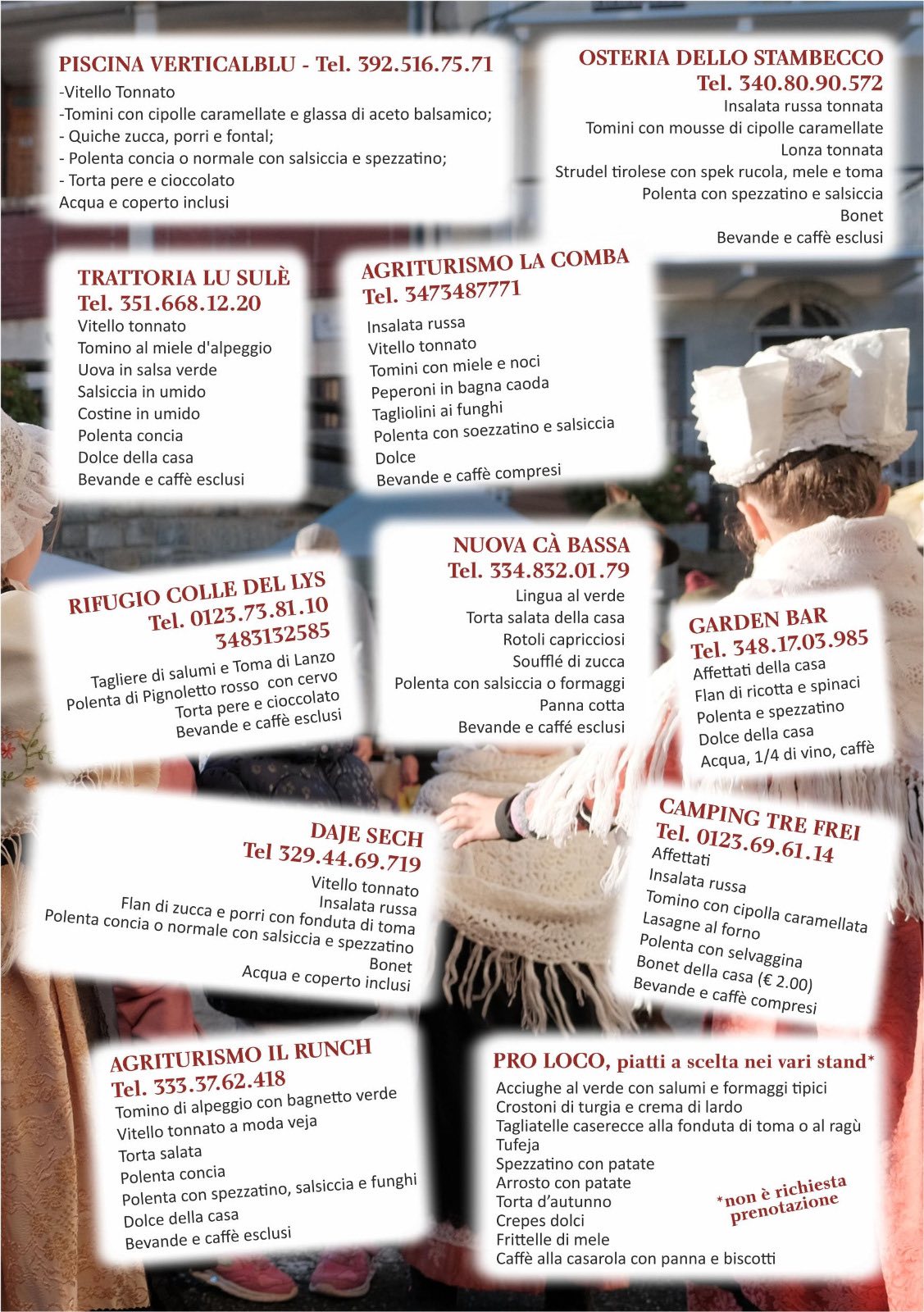 Dalle 8.00 alle 18.00 le vie del paese ospiteranno la Mostra Mercato di San Martino, dedicata ai prodotti tipici e all’artigianato. In piazza del mercato saranno presenti gli stand gastronomici delle Pro Loco di Ala di Stura, Ceres, Germagnano, Groscavallo, Lemie, Traves, Usseglio e Viù, che proporranno piatti tradizionali come acciughe al verde, formaggi e salami di turgia, tagliatelle caserecce, tufeja, spezzatino e arrosto con patate, dolci autunnali e il tipico “caffè alla casarola”. Immancabili anche le frittelle di mele, a cura della Pro Loco locale, le caldarroste e il vin brulè, preparati dal Gruppo Alpini di Viù. Accanto alle prelibatezze preparate dalle Pro Loco delle Valli di Lanzo, anche una ricca proposta da parte dei ristoranti locali, con possibilità di pranzo con menù convenzionato al costo di 18 euro. Le attività aderenti sono Piscina Verticalblu, Osteria dello Stambecco, Trattoria Lu Sulè, Agriturismo La Comba, Rifugio Colle del Lys, Nuova Cà Bassa, Garden Bar, Daje Sech, Camping Tre Frei e l’Agriturismo Il Runch. Per riservare il proprio posto è obbligatoria la prenotazione contattando direttamente il locale.