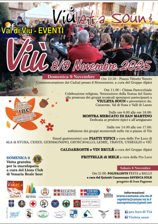 Tra i colori dell’autunno e il calore delle note tradizionali, Viù si prepara a vivere un weekend che celebra le sue radici più autentiche. Nel weekend dell’8 e 9 novembre torna la storica Fiera di San Martino, con un ricco programma di eventi dove si intrecciano musica popolare e tradizioni gastronomiche. Dopo il successo della rassegna di settembre dedicata al canto, il progetto “Viuleta-Soun” amplia i suoi orizzonti verso il “suono”, per esplorare le vibrazioni collettive della musica strumentale e delle danze popolari, in un dialogo profondo con il territorio e la comunità.