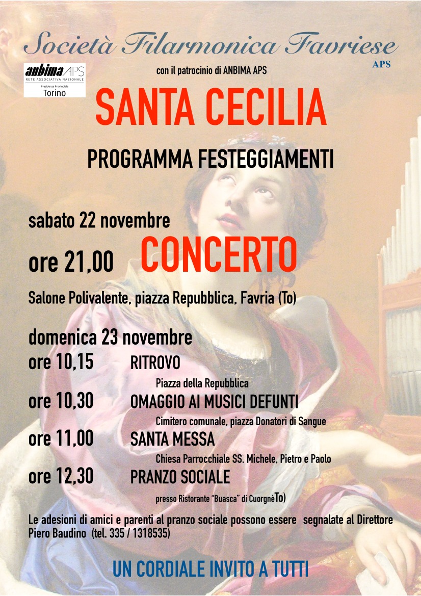 FAVRIA. Anche quest’anno la Società Filarmonica Favriese APS, con il patrocinio di ANBIMA Torino, invita tutta la cittadinanza a partecipare ai festeggiamenti in onore di Santa Cecilia, patrona della musica e dei musicisti.