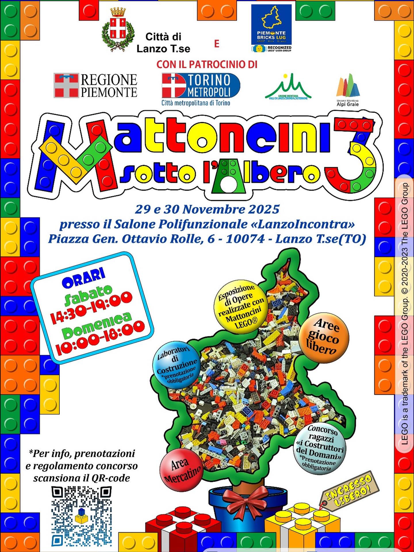 Lanzo Torinese è pronta a inaugurare la stagione natalizia con uno degli appuntamenti più attesi dagli appassionati di costruzioni e immaginazione. Il 29 e 30 novembre 2025, il Salone Polifunzionale LanzoIncontra torna ad ospitare “Mattoncini sotto l’Albero”, il grande evento organizzato da Piemonte Bricks LUG con il patrocinio della Città di Lanzo, della Regione Piemonte della Città Metropolitana di Torino e delle Unioni Montane del territorio.