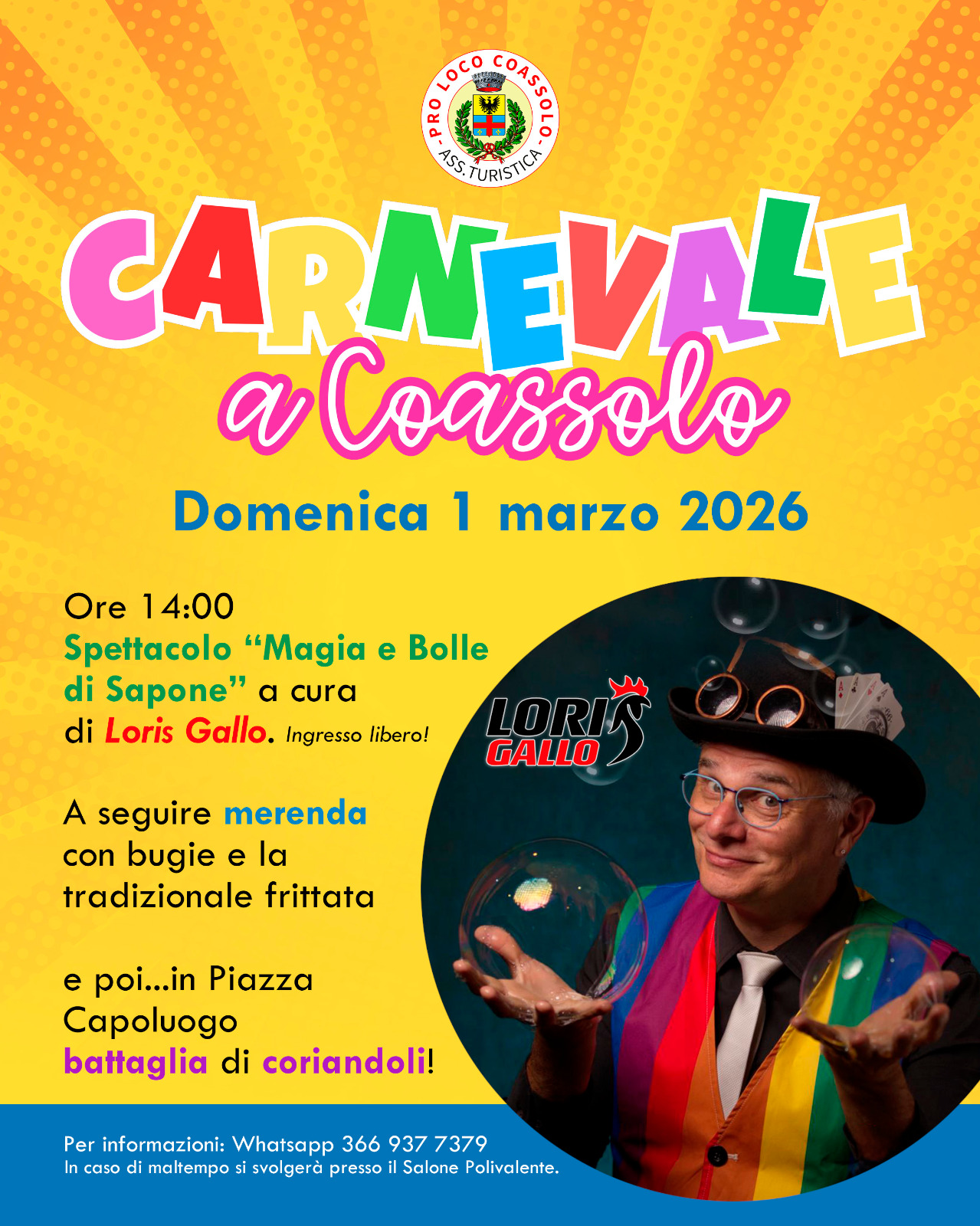 La Pro Loco di Coassolo Torinese apre ufficialmente le attività del 2026 con un pomeriggio dedicato alla festa più colorato dell’anno. Domenica 1° marzo il paese si animerà con maschere e coriandoli per festeggiare il Carnevale. Sarà con un pomeriggio adatto a tutta la famiglia, dedicato in particolare ai più piccoli.