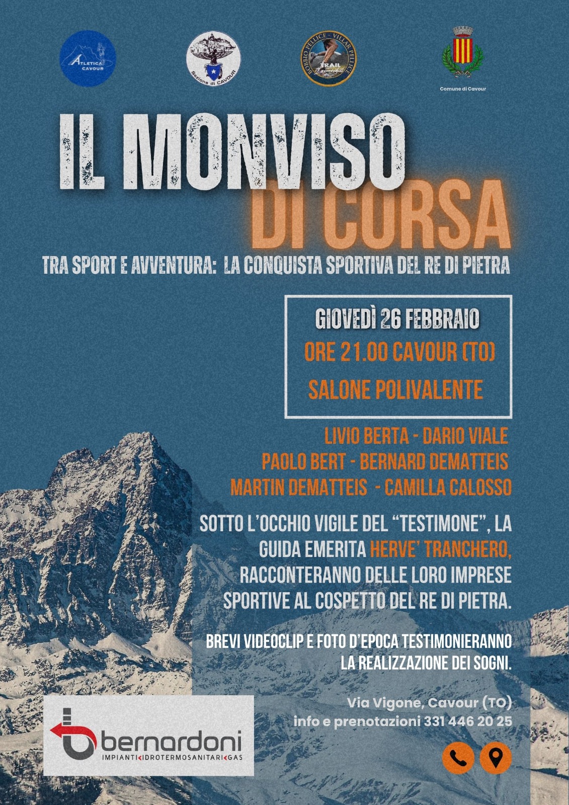 Il “Re di Pietra” chiama, e Cavour risponde con una serata dedicata allo sport e alle grandi imprese ai piedi del Monviso. Giovedì 26 febbraio, alle ore 21.00, il Salone Polivalente di Cavour (TO) ospiterà l’evento Il Monviso di corsa, un incontro dove troveranno spazio testimonianze ed emozioni, accompagnate da immagini spettacolari.