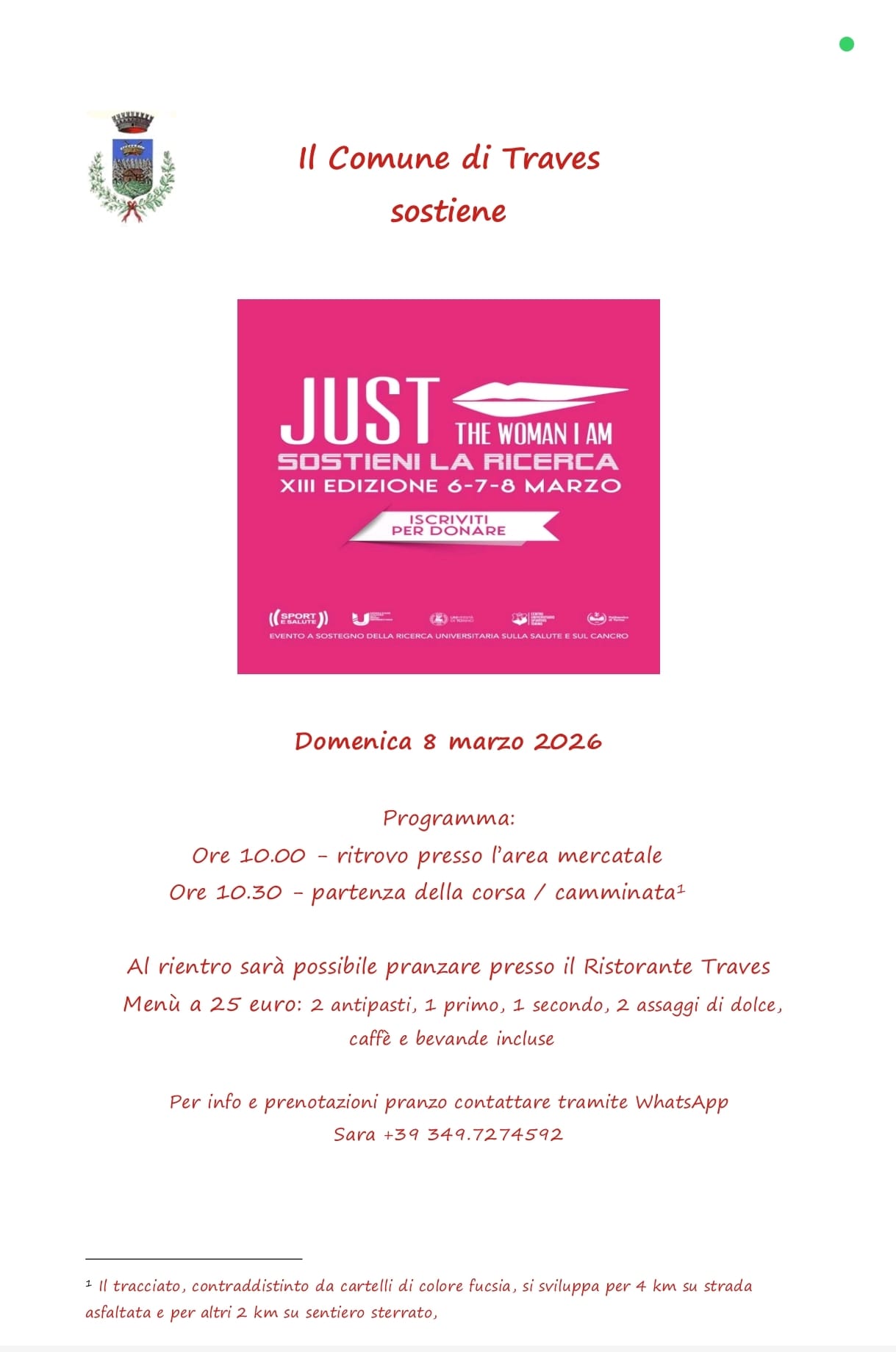 L’iniziativa sostiene la ricerca universitaria sul cancro e promuove i valori della cura, della prevenzione e dell’inclusività. Il ritrovo è fissato alle ore 10 presso l’area mercatale, mentre la partenza della corsa-camminata è prevista per le 10.30.
