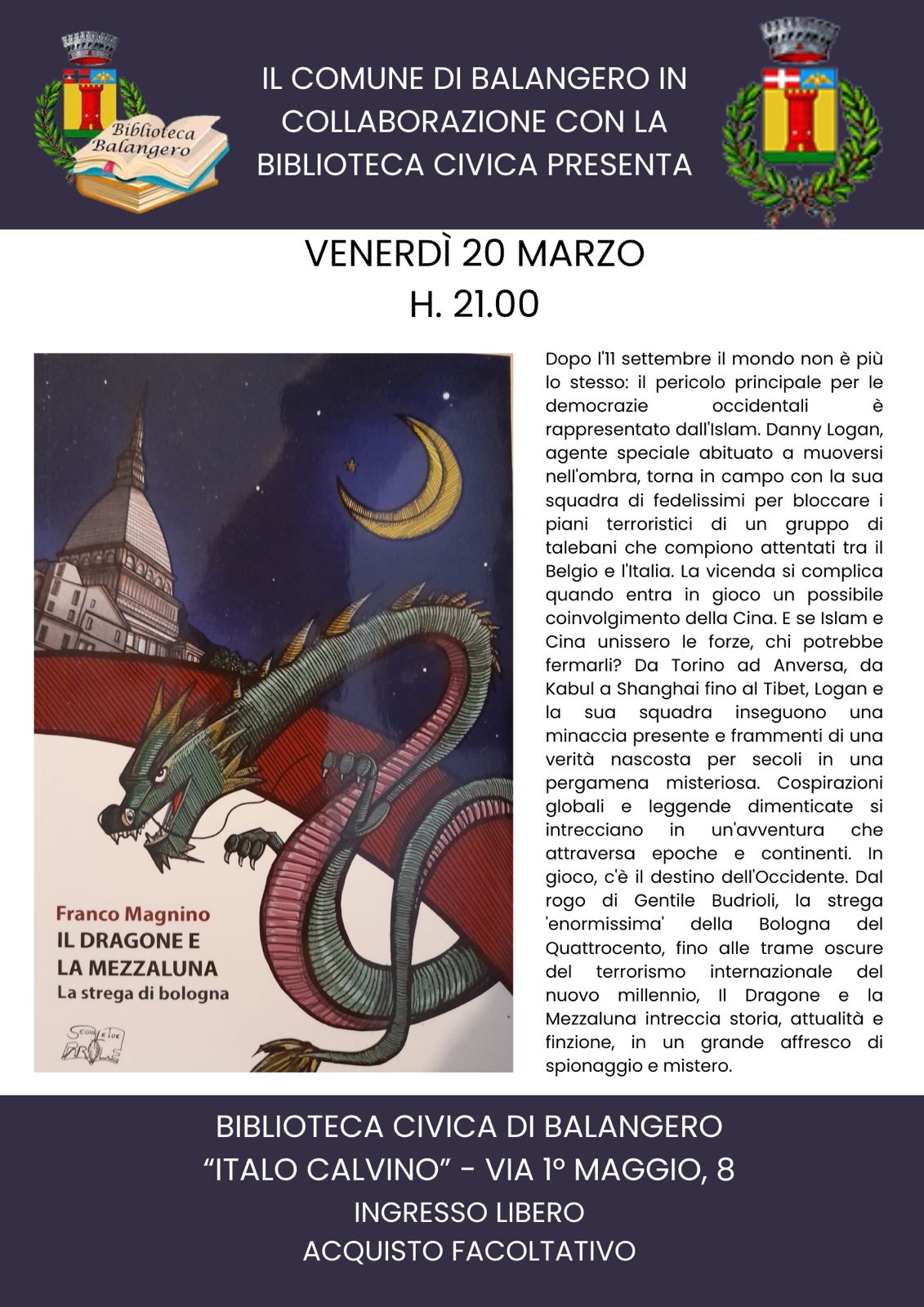 Una vita dedicata alla scuola e, oggi, sempre più alla scrittura. Franco Magnino, volto noto nel panorama educativo del Canavese, torna a Balangero per presentare il suo nuovo romanzo “Il dragone e la mezzaluna”, pubblicato dalla casa editrice Seguile le tue parole. L’appuntamento è fissato per venerdì 20 marzo presso la Biblioteca civica Italo Calvino, dove l’autore sarà ospite dell’assessore alla cultura di Balangero Ivan Cavalli, suo amico di lunga data.