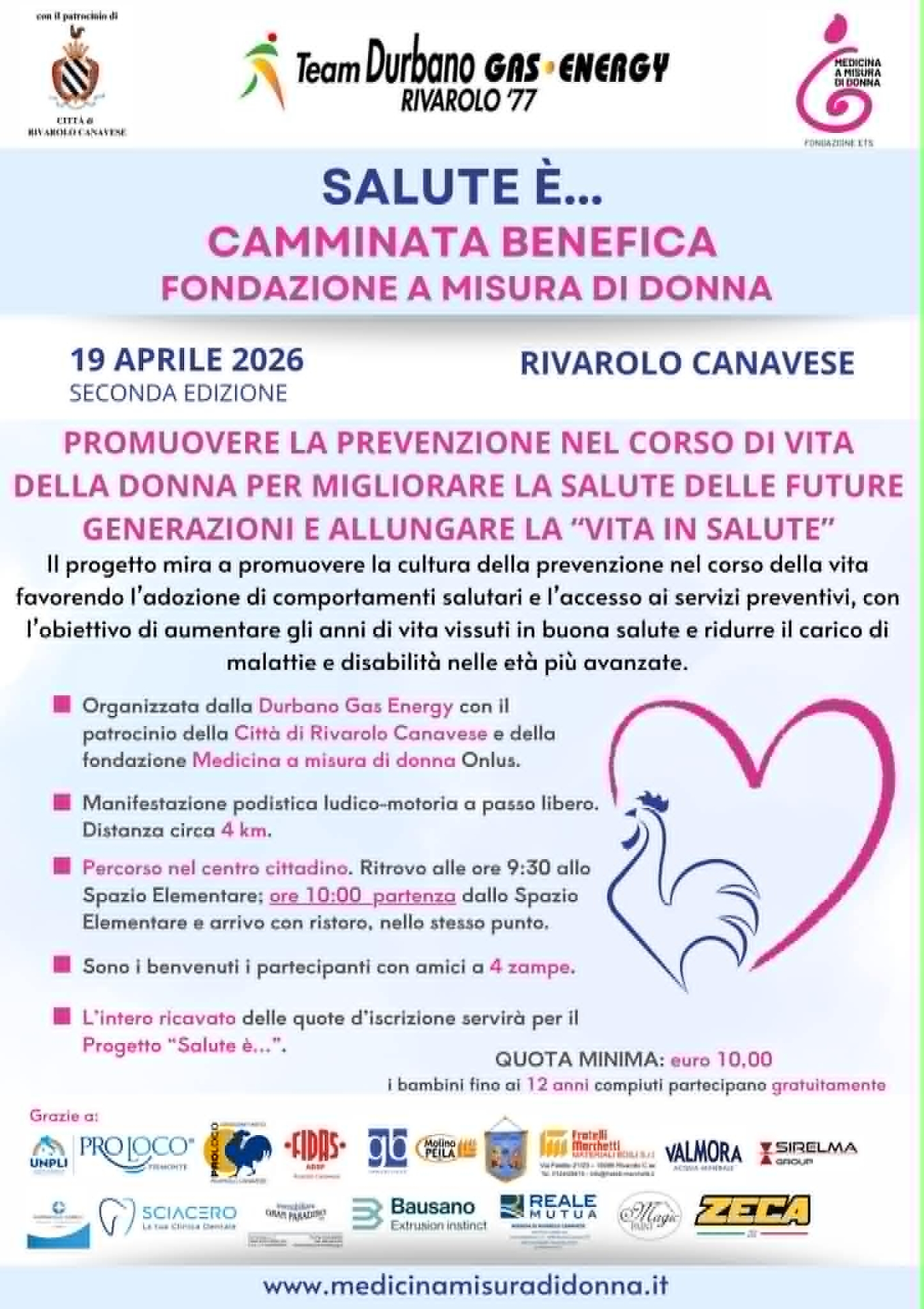 Il prossimo 19 aprile 2026, a Rivarolo Canavese, torna la seconda edizione della Camminata Benefica “Salute è…”, un appuntamento dedicato alla promozione della prevenzione e del benessere lungo tutto il corso della vita della donna.