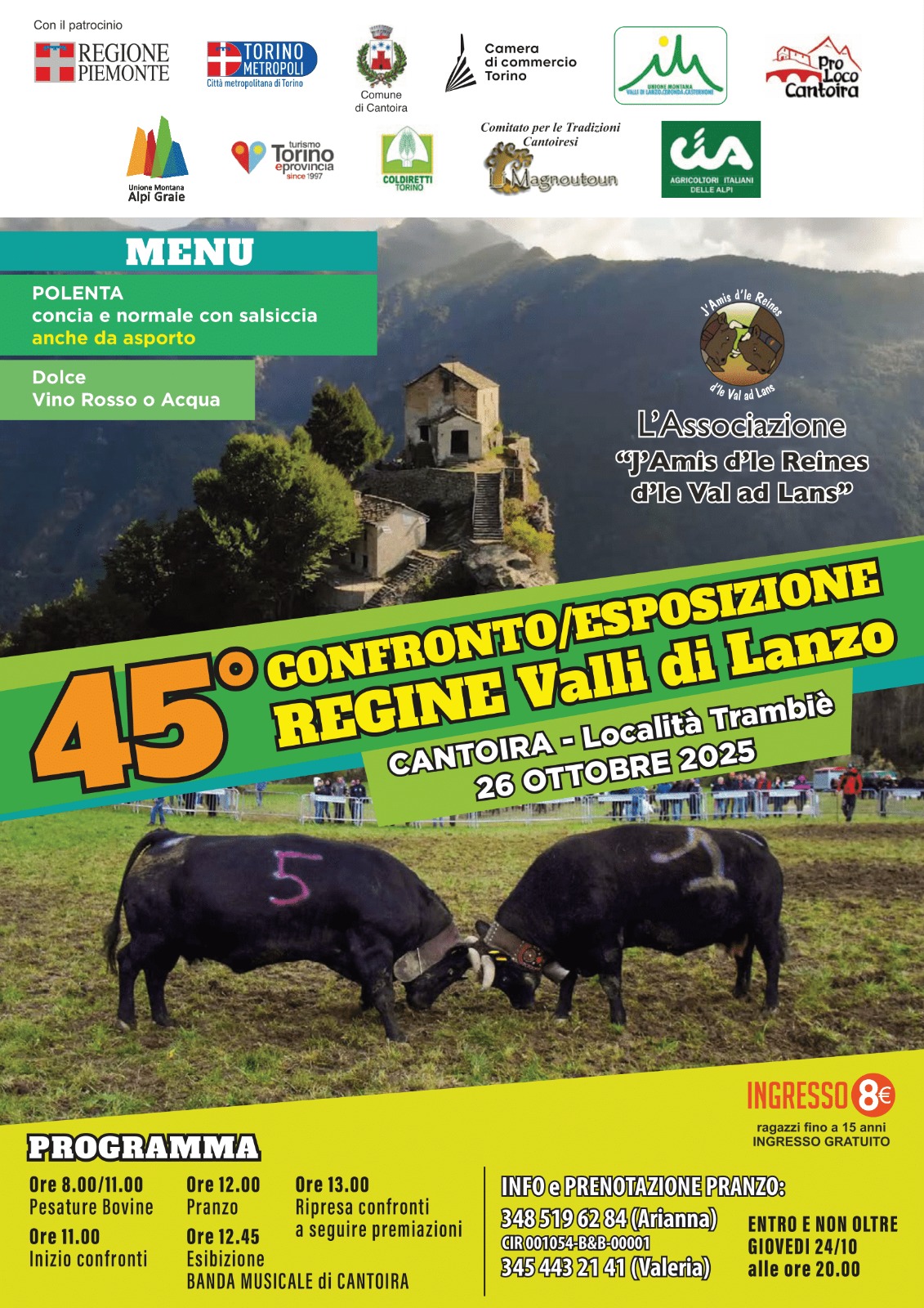 Nel fine settimana torna uno degli appuntamenti più attesi dell’autunno valligiano. Domenica 26 ottobre 2025 la località Trambiè di Cantoira ospiterà infatti il 45° Confronto/Esposizione delle Regine delle Valli di Lanzo, organizzato dall’associazione J’Amis d’le Reines d’le Val ad Lans, con il patrocinio della Regione Piemonte, della Città Metropolitana di Torino, del Comune di Cantoira e di numerosi enti locali.