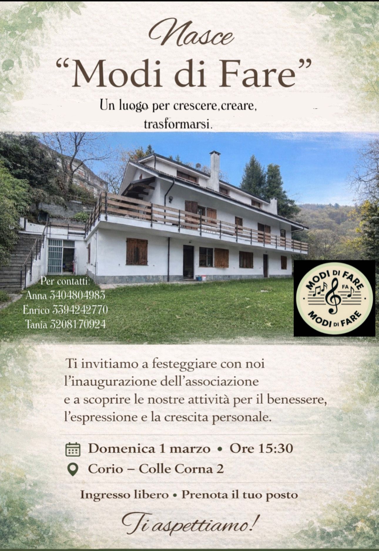 Domenica 1 marzo alle 15.30, in Colle Corna 2 a Corio apre ufficialmente la sede dell’associazione “Modi di Fare”. Un taglio del nastro che segna la conclusione di un intervento di recupero non solo edilizio, ma anche sociale: un immobile e un terreno lasciati per anni all’abbandono tornano oggi a vivere come spazio di incontro e crescita personale.