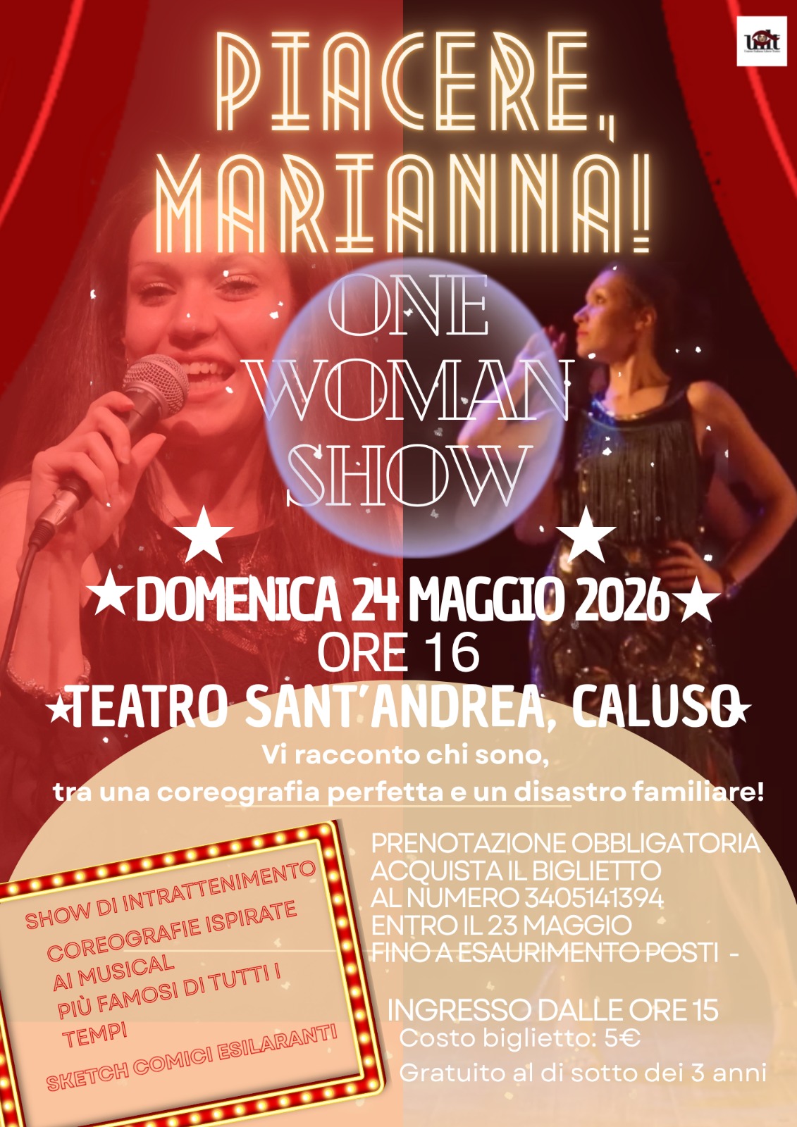 L’appuntamento è fissato per domenica 24 maggio alle ore 16 all’Oratorio Sant’Andrea di Caluso con lo spettacolo "Piacere Marianna - One Woman Show", che segna il ritorno dell’artista nel panorama culturale cittadino. Dopo l’esordio nel 2018 con la Compagnia dello Zodiaco e un percorso tra palcoscenici regionali e studi televisivi, l’artista si presenta per la prima volta al pubblico come nuova residente calusiese.