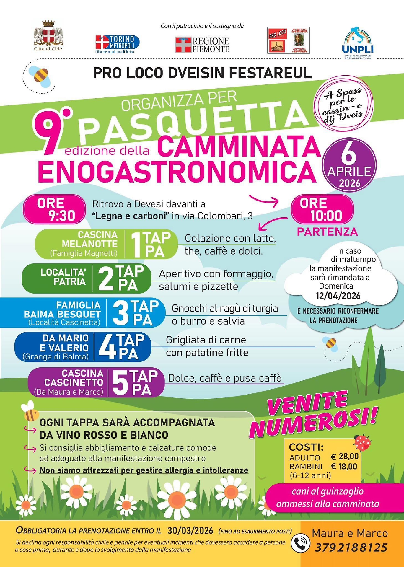 Una giornata all’aria aperta tra cascine, sentieri di campagna e sapori della tradizione. A Devesi di Ciriè torna uno degli appuntamenti più attesi della Pasquetta: la Camminata enogastronomica “A spass per le cassin-e dij Dveis”, giunta alla nona edizione. L’iniziativa, organizzata dalla Pro Loco Dveisin Festareul con il patrocinio della Città di Ciriè, della Città metropolitana di Torino e della Regione Piemonte, è in programma lunedì 6 aprile 2026 e promette ancora una volta di richiamare centinaia di partecipanti.