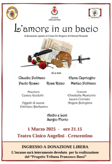 Per l'occasione sabato 1 marzo alle ore 21.15 presso il teatro Civico Angelini di Crescentino andrà in scena lo spettacolo "L'amore è un bacio", evento presentato dalla Compagna Teatrale Separè diretta da Claudio Politano. Ua storia, ispirata al Cirano De Bergerac di Edmond Rostand. L'ingresso è a donazione libera e l'incasso sarà interamente devoluto per la la realizzazione del "Progetto Tribuna Francesco Bassi". Sul palco, insieme al maestro Politano, si esibiranno: Paolo Rosso, Elena Caprioglio, Rosa Rizzo e Matteo Politano. I costumi sono invece di Elisabetta Mesturini, Laura Corrado e Angela Bolognini, mentre audio e luci saranno a cura di Sergio Florio. Completano lo staff Cesare Guidotti ed Emiliano Barbesino.