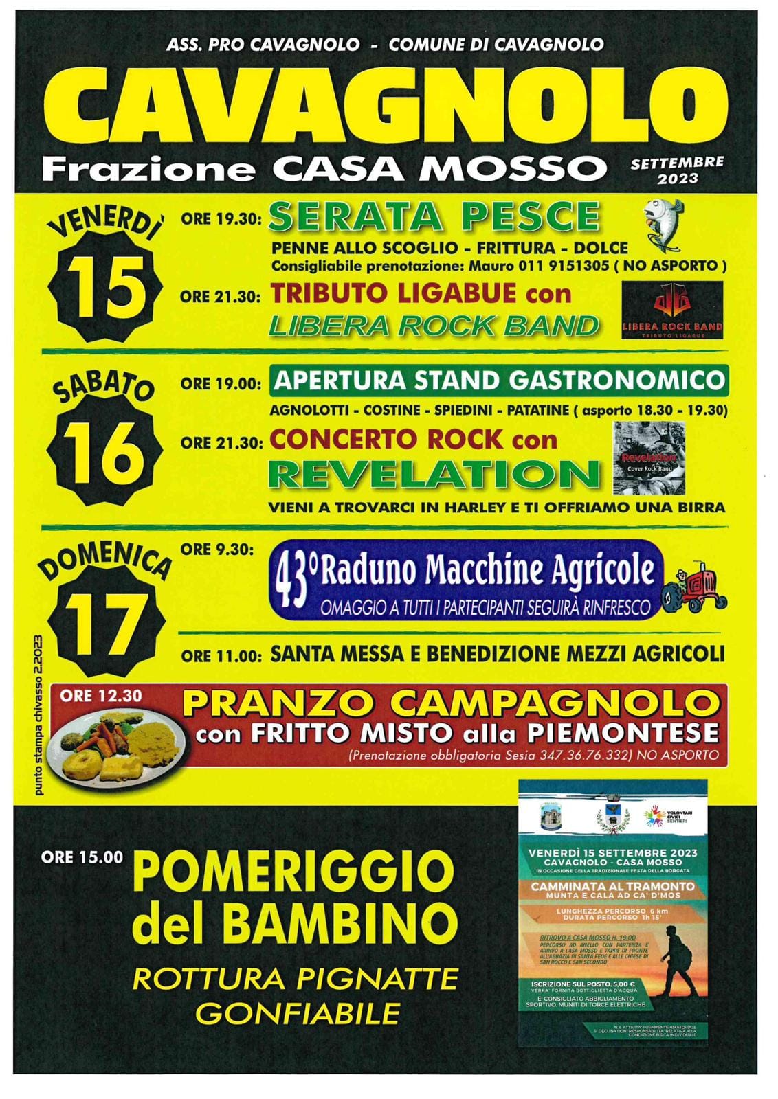 La Festa di Casa Mosso, organizzata dall'Associazione Pro Cavagnolo dal 15 al 17 settembre 2023, è un evento che offre una varietà di attività per un pubblico diversificato. Ecco una breve spiegazione degli eventi: