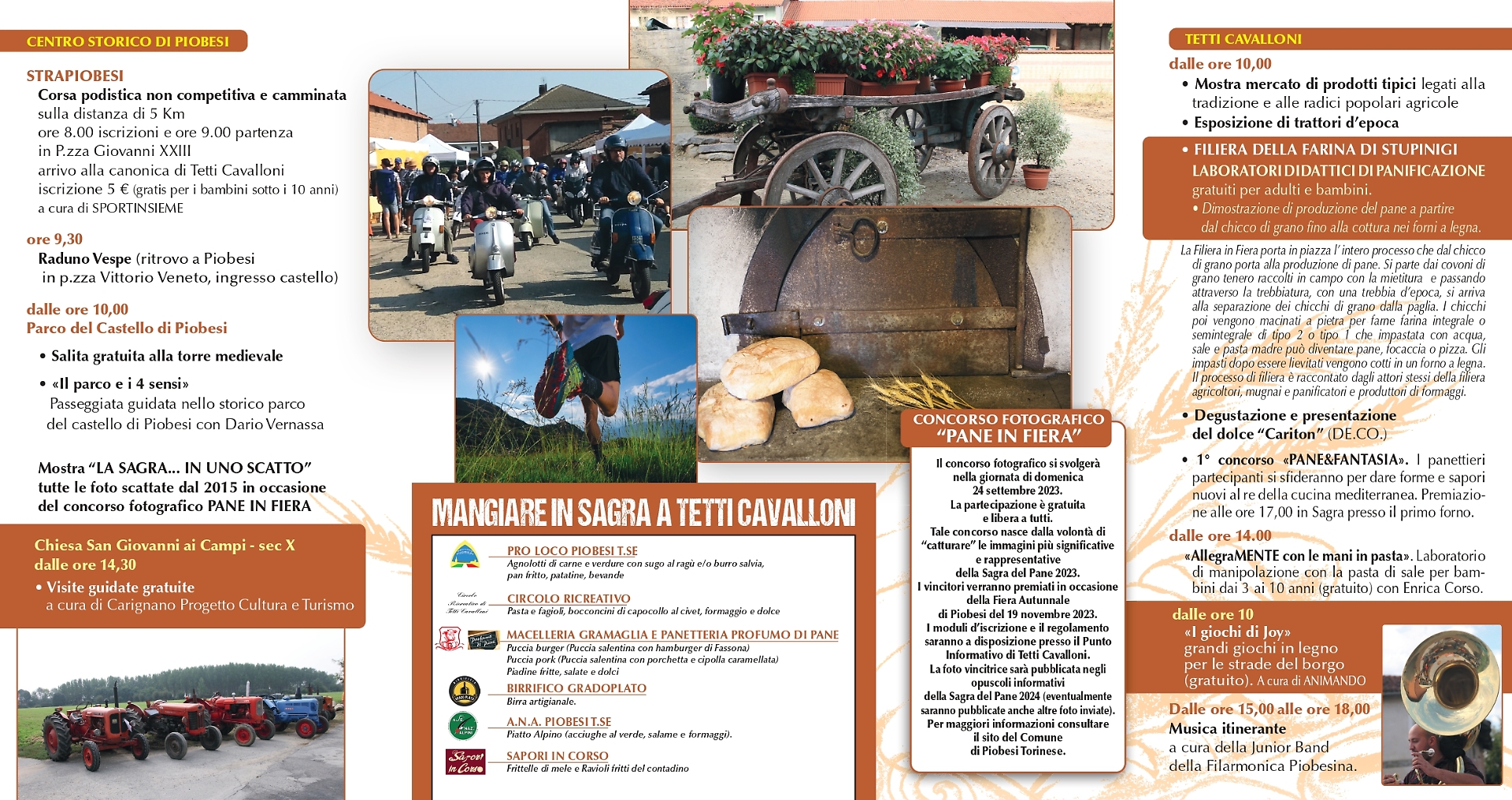 Domenica 24 settembre il cuore della manifestazione sarà ancora una volta la frazione Tetti Cavalloni, dove a partire dalle 10 saranno allestite la mostra mercato dei prodotti tipici legati alla tradizione e alle radici popolari agricole e un’esposizione di trattori d’epoca. La Filiera della Farina di Stupinigi proporrà gratuitamente i laboratori didattici di panificazione per adulti e bambini. Sarà possibile assistere alla dimostrazione della produzione del pane a partire dal chicco di grano e fino alla cottura nello storico forno a legna dei Tetti Cavalloni. La Filiera in Fiera porta in piazza l’intero processo che dal chicco di grano porta alla pagnotta. Si parte dai covoni di grano tenero raccolti in campo con la mietitura e, passando attraverso la trebbiatura con una trebbia d’epoca, si arriva alla separazione dei chicchi di grano dalla paglia. I chicchi poi vengono macinati a pietra per farne farina integrale o semintegrale di tipo 2 o tipo 1 che, impastata con acqua, sale e pasta madre può diventare pane, focaccia o pizza. Gli impasti dopo essere lievitati vengono cotti in un forno a legna. Il processo è raccontato dagli attori della filiera: agricoltori, mugnai, panificatori e produttori di formaggi. Immancabili la presentazione e la degustazione del dolce “Caritôn”, che si fregia della Denominazione Comunale. Nella prima edizione del concorso “Pane & Fantasia” i panettieri si sfideranno per dare forme e sapori nuovi al re della cucina mediterranea. La premiazione è in programma alle 17. “AllegraMENTE con le mani in pasta” è invece lo slogan di un laboratorio di manipolazione con la pasta di sale per bambini dai 3 ai 10 anni, tenuto gratuitamente da Enrica Corso a partire dalle 14. “I giochi di Joy” in legno saranno a disposizione nelle strade della frazione a partire dalle 10, mentre dalle 15 alle ore 18 la musica itinerante sarà a cura della Junior Band della Filarmonica Piobesina. La partecipazione al concorso fotografico “Pane in Fiera” è gratuita e libera. I vincitori verranno premiati in occasione della Fiera Autunnale di Piobesi del 19 novembre. I moduli d’iscrizione e il regolamento saranno a disposizione al punto Informativo di Tetti Cavalloni. La foto vincitrice sarà pubblicata negli opuscoli informativi della Sagra del Pane 2024.