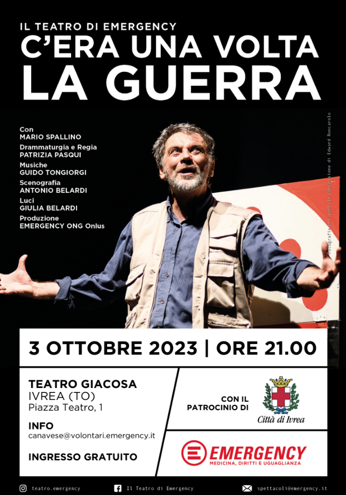 C’era una volta la guerra, spettacolo teatrale prodotto da EMERGENCY Ong Onlus, interpretato da Mario Spallino, per la regia e drammaturgia di Patrizia Pasqui, sarà in scena il 3 ottobre alle ore 21.00 presso il Teatro Giacosa di Ivrea, con il patrocinio del Comune di Ivrea.