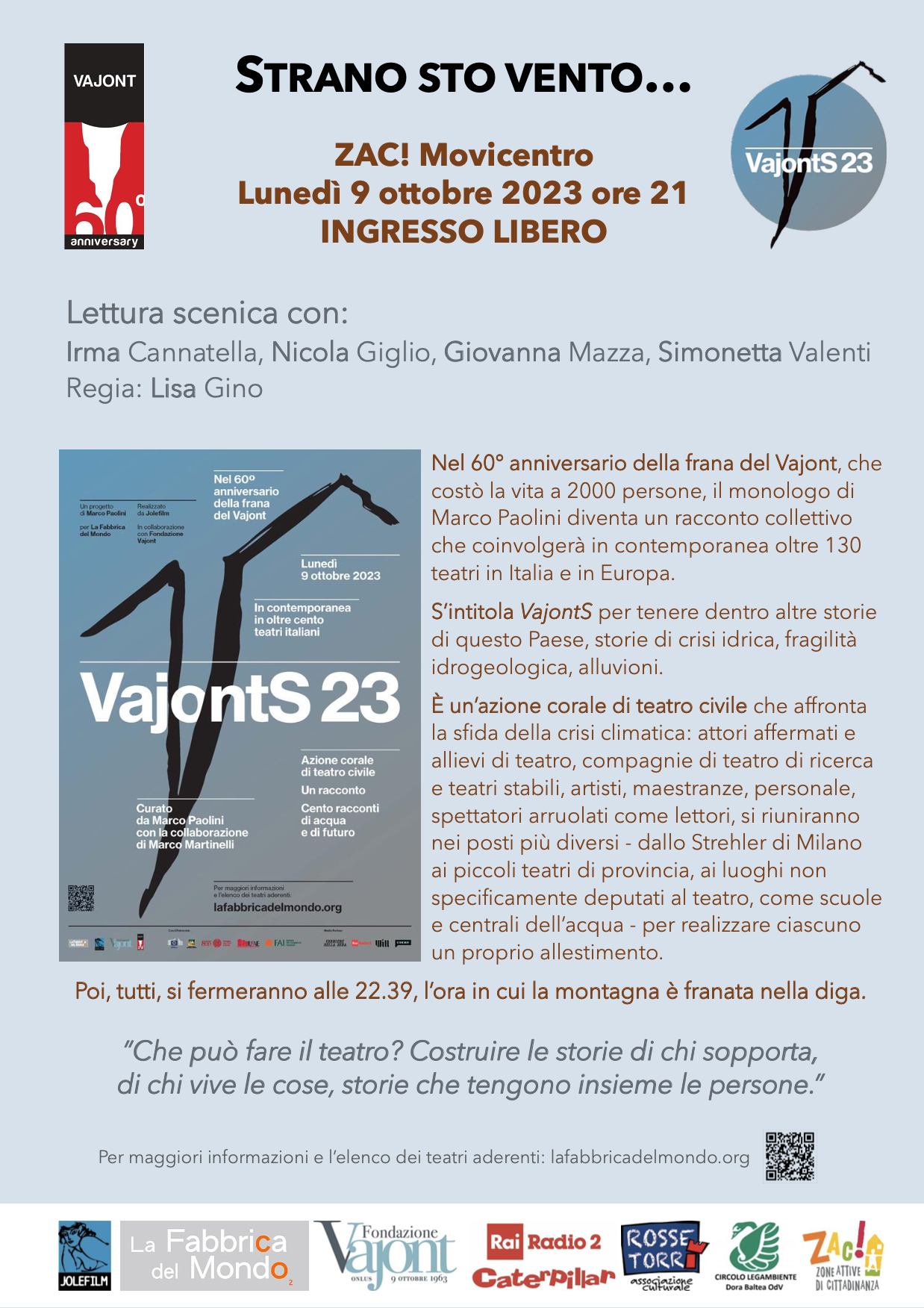 Associazione Rosse Torri, ZAC! Movicento e LegAmbiente Ivrea rispondono alla chiamata di teatro civile promossa da Marco Paolini e La Fabbrica del Mondo per ricordare la tragedia del Vajont nel suo sessantesimo anniversario. Il 9 ottobre, alle ore 21:00, presso lo ZAC! Movicentro avrà luogo la lettura scenica del testo VajontS 23, messo a disposizione da Marco Paolini nella versione corale adattata da Marco Martinelli.La lettura si svolgerà in contemporanea in più di 130 tra teatri e spazi comuni, in Italia e anche in alcune città europee.Noi ci troveremo nell'atrio della stazione, luogo in cui l'orologio e il tempo sono attori primari, a ricordarci che dobbiamo stare attenti affinché certi episodi non vengano dimenticati e soprattutto non si ripetano. E mai come oggi il ticchettio di tale monito deve risuonare forte nelle nostre menti. Rivolgiamo quindi un invito caloroso a partecipare e fare memoria, insieme!Giovanna, Irma, Lisa, Nicola e Simonetta