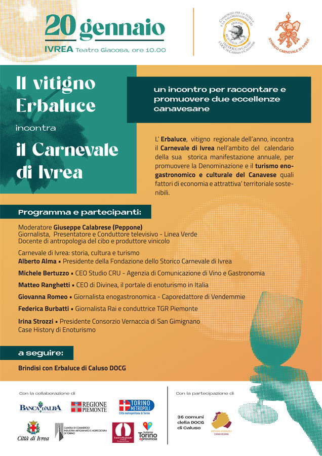 Sabato 20 gennaio, dalle 10 alle 13, il Teatro Giacosa ospiterà l’incontro con tavola rotonda promosso dal Consorzio per la tutela e valorizzazione dei vini DOCG di Caluso e DOC di Carema e Canavese e dallo Storico Carnevale di Ivrea: un’occasione per raccontare due eccellenze canavesane e promuovere la denominazione e il turismo eno-gastronomico e culturale del Canavese quali fattori di economia e attrattività territoriale.