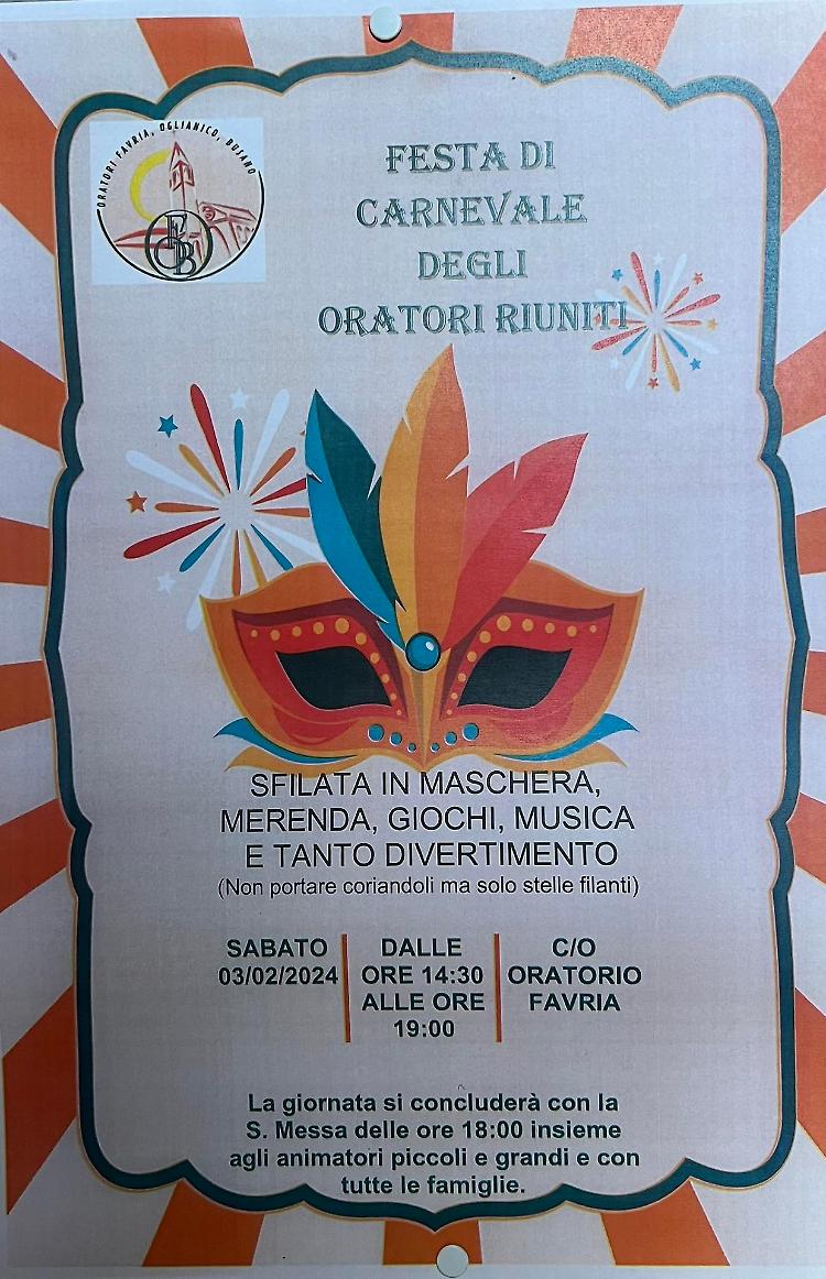 Festa di carnevale degli Oratori riuniti. L'appuntamento è per sabato 3 febbraio presso l'Oratorio i Favria dove arriveranno anche i bambini e i ragazzi di Oglianico e di Busano.