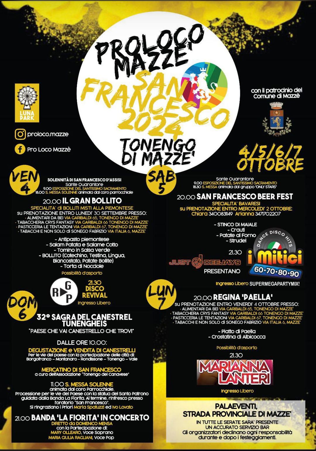 Dal 4 al 7 ottobre 2024, la Pro Loco di Mazzè organizza i festeggiamenti per San Francesco 2024 a Tonengo di Mazzè, un evento ricco di appuntamenti gastronomici, musica e tradizioni, con il patrocinio del Comune di Mazzè. Quattro giorni di celebrazioni per onorare la festa patronale con un programma pensato per coinvolgere tutta la comunità.