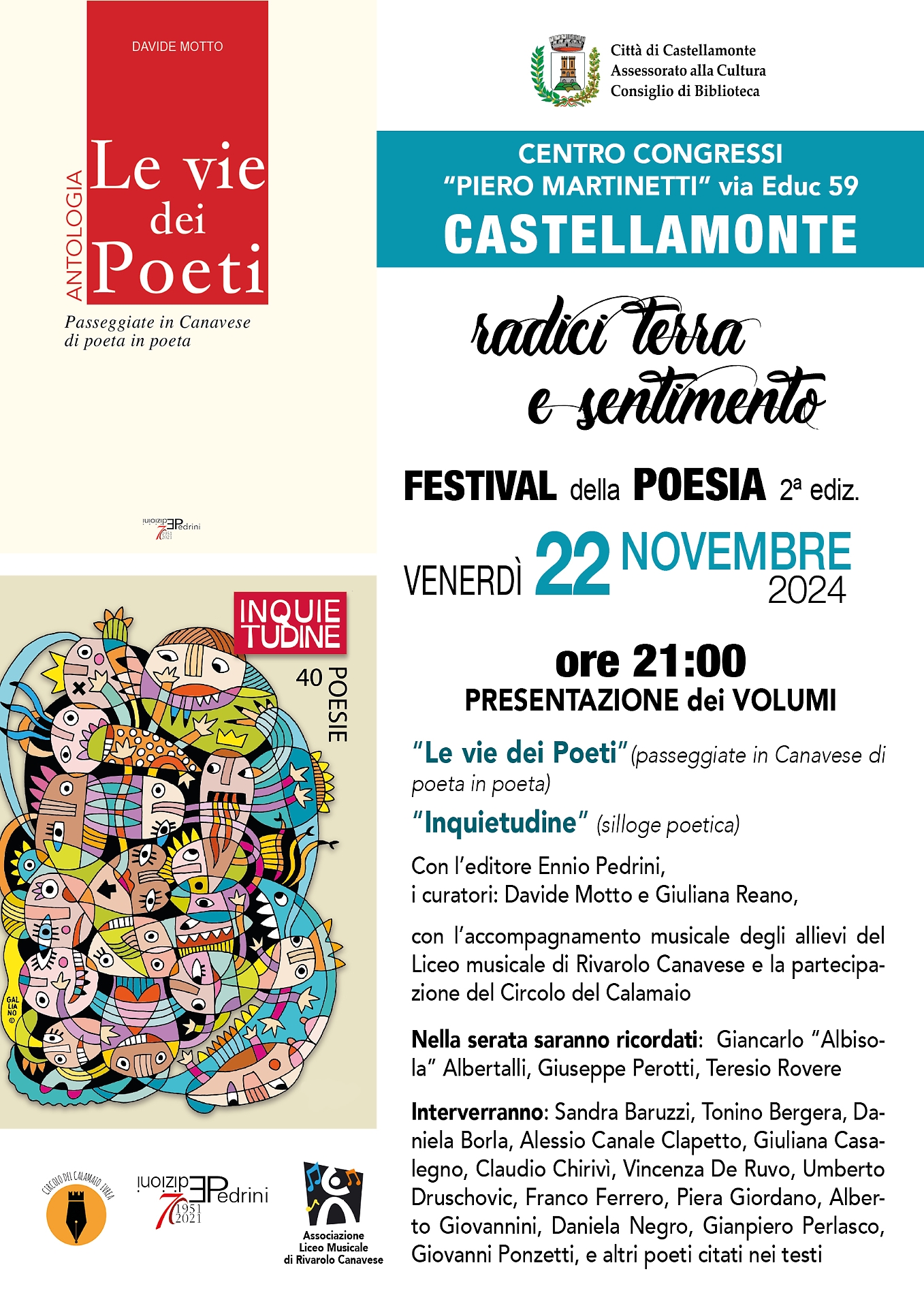 Ritorna a Castellamonte la grande poesia con l'evento “Radici, Terra e Sentimento” che sarà ospitato al Centro Congressi Martinetti venerdì 22 novembre 2024 alle ore 21.00, proposto dalla Edizioni Pedrini con il sostegno della Città di Castellamonte, Assessorato alla Cultura, e del Consiglio di Biblioteca.