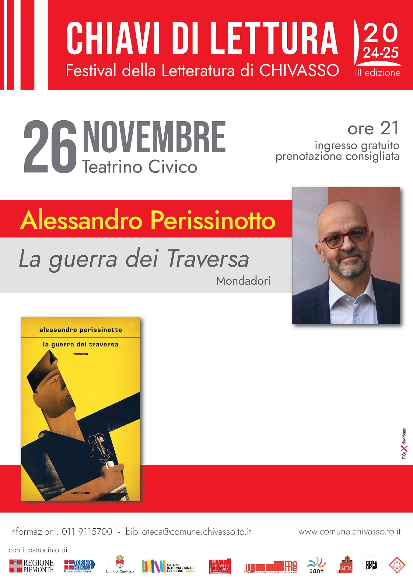 Martedì 26 novembre, alle ore 21:00, il Teatrino Civico di Chivasso ospiterà lo scrittore Alessandro Perissinotto per la presentazione del suo ultimo romanzo, La guerra dei Traversa, edito da Mondadori. L'evento rientra nella terza edizione del Festival della Letteratura "Chiavi di Lettura", organizzato dall'Assessorato alla Cultura del Comune di Chivasso.