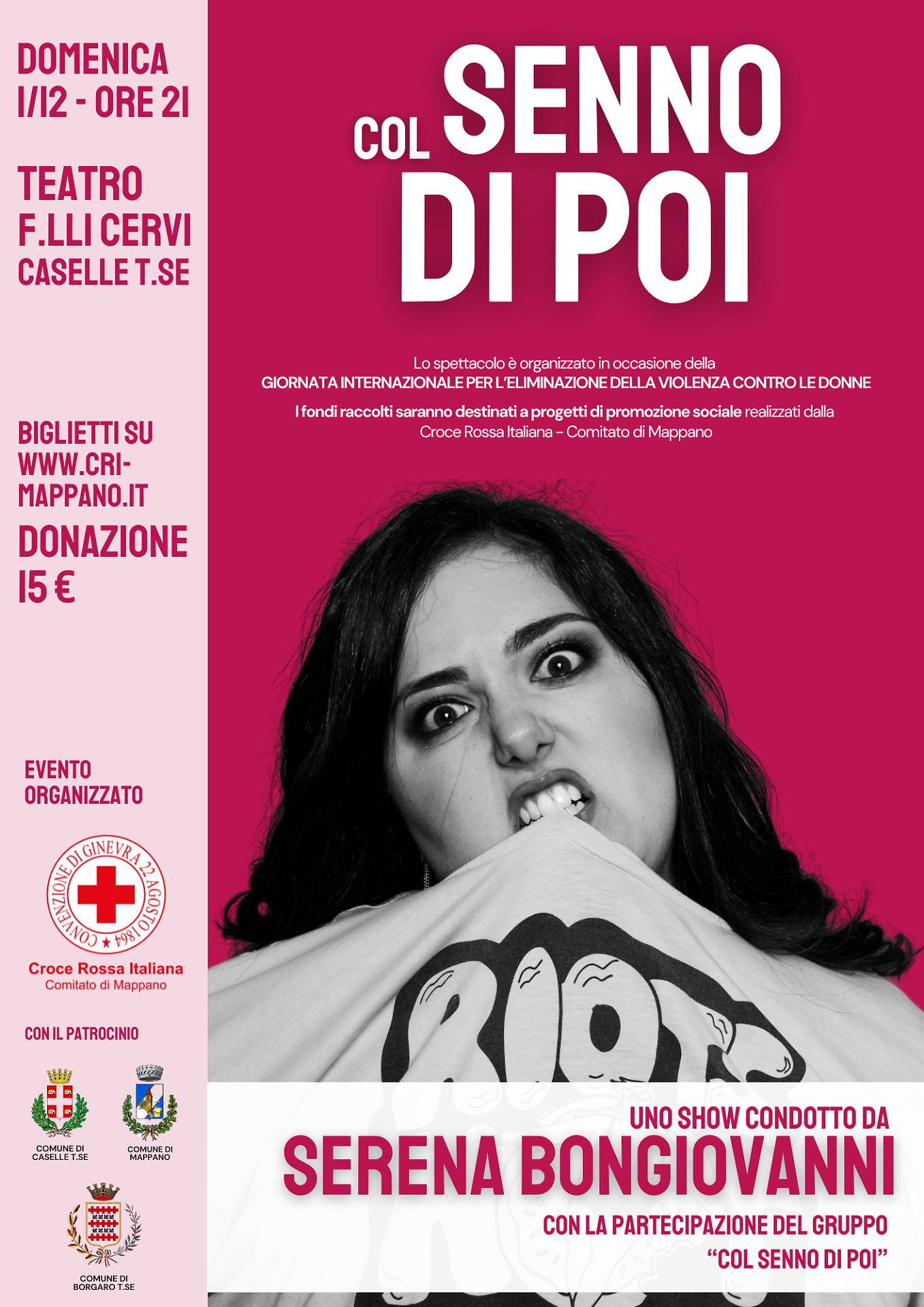 Domenica 1 dicembre alle ore 21:00, il Teatro F.lli Cervi di Caselle Torinese ospiterà lo spettacolo teatrale "Col Senno di Poi", un evento organizzato dalla Croce Rossa Italiana - Comitato di Mappano in occasione della Giornata Internazionale per l'Eliminazione della Violenza contro le Donne.