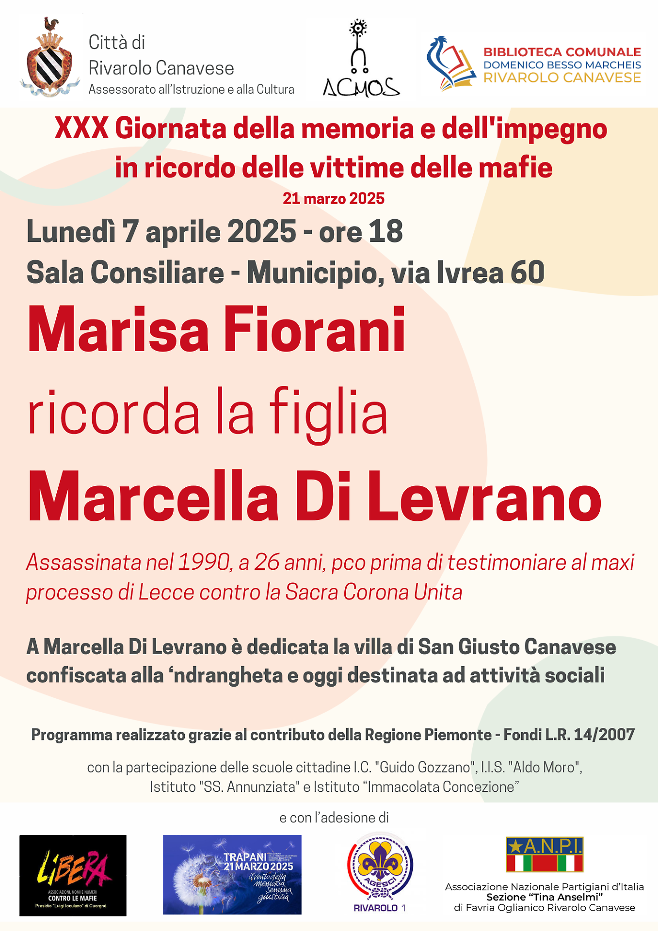 Lunedì 7 aprile alle 18:00, nella sala consiliare di Rivarolo Canavese, si svolgerà un incontro che non è solo una commemorazione ma un atto di giustizia civile e memoria attiva. A parlare sarà Marisa Fiorani, madre di Marcella Di Levrano, giovane donna assassinata brutalmente dalla Sacra Corona Unita nel 1990. Una testimonianza, la sua, che scuote e commuove, perché racconta non solo la ferocia della mafia, ma anche il dolore di una madre che da trentacinque anni cerca verità, giustizia e soprattutto memoria. Marcella Di Levrano era nata il 18 aprile 1964 a Mesagne, in provincia di Brindisi.