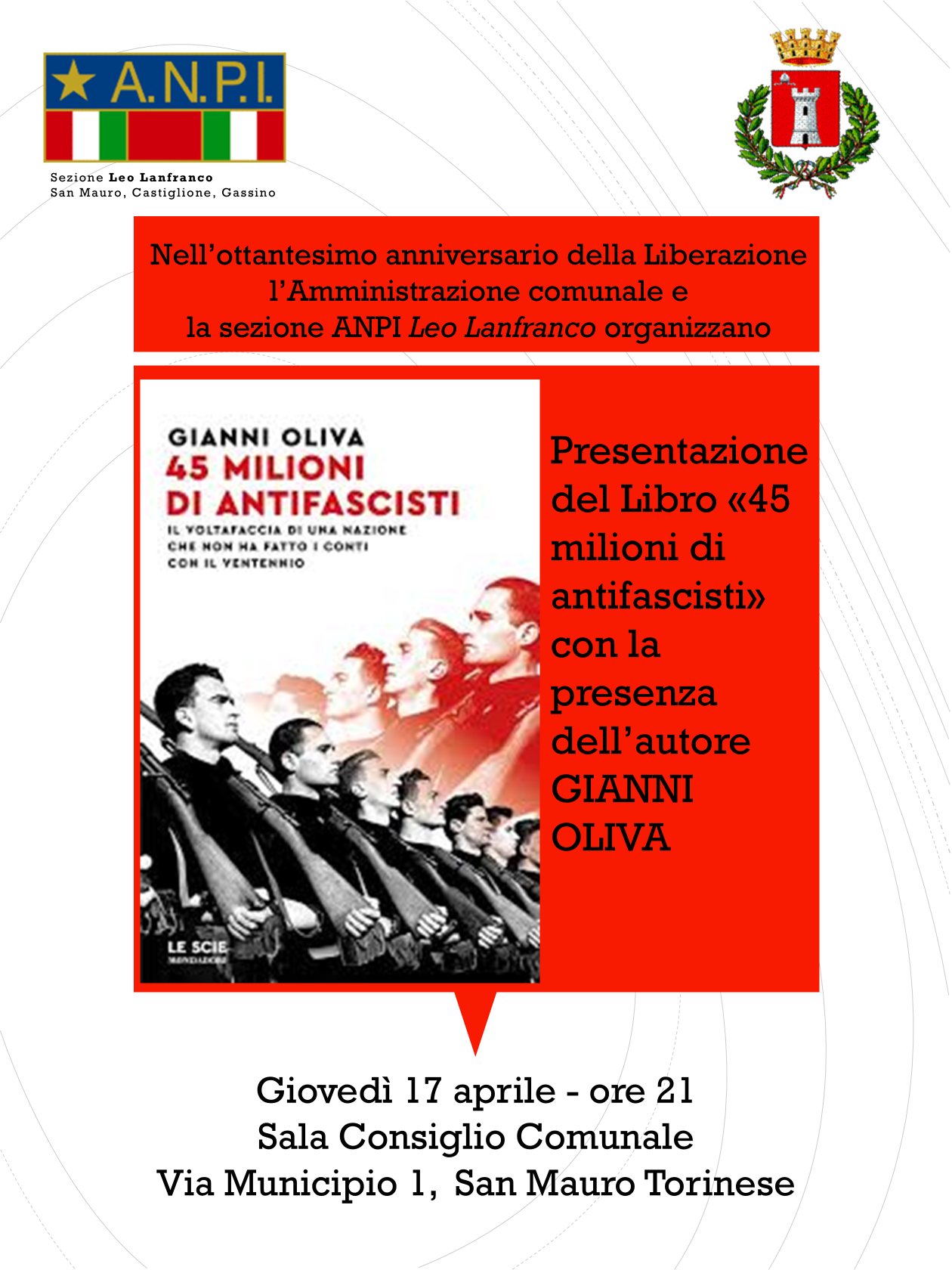 Così recita la quarta di copertina del libro "45 milioni di antifascisti", pubblicato da Mondadori nel 2024, scritto dallo storico e giornalista piemontese Gianni Oliva, noto per i suoi numerosi saggi storici sulla Resistenza.