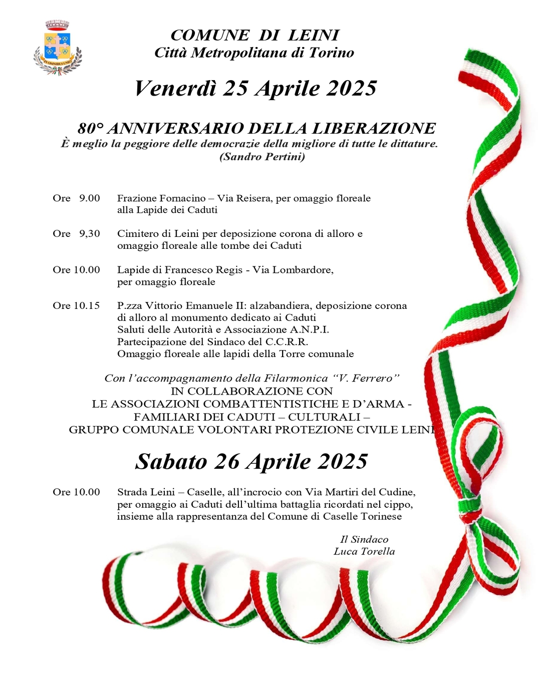 La mattinata inizierà alle ore 9 a Fornacino, in via Reisera, dove sarà reso un omaggio floreale alla lapide dei Caduti, in segno di gratitudine per chi ha sacrificato la propria vita per la libertà. Subito dopo, alle 9.30, il corteo si sposterà verso il cimitero di Leini, dove saranno deposte corone d’alloro e fiori sulle tombe dei Caduti, per rinsaldare il legame tra il presente e il sacrificio di chi ha combattuto per un’Italia libera.