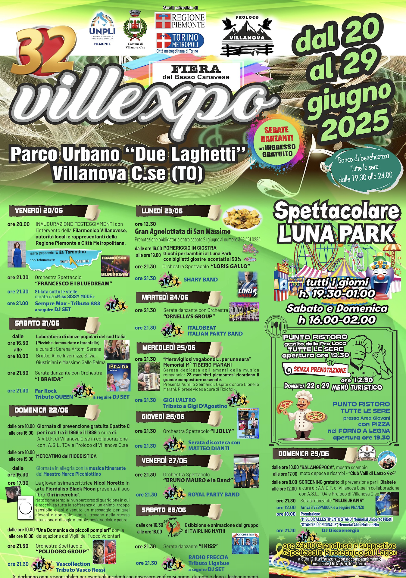 Villexpo dedica inoltre uno spazio specifico ai giovani con serate a tema, tributi musicali, DJ set e disco party che abbracciano i classici italiani, gli anni ’90 e omaggi alle grandi band internazionali. Non mancheranno nemmeno i momenti legati alla musica tradizionale: il Memorial Tiberio Marani, in programma mercoledì 25 giugno, sarà l’occasione per ricordare il celebre maestro attraverso le note del liscio piemontese e romagnolo.