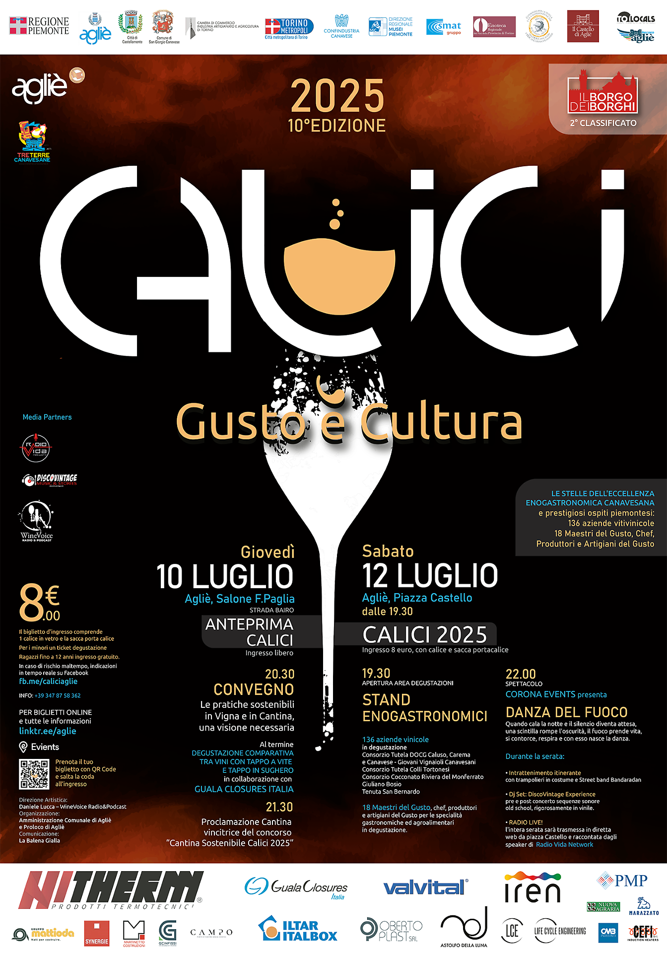 Ma “Calici” è anche spettacolo. A metà serata, torneranno i Corona Events, tra le compagnie di nouveau cirque più spettacolari d’Italia, con una nuova creazione di grande impatto visivo e sonoro: “Danza del Fuoco”, uno show che promette emozioni in equilibrio tra musica, fiamme e poesia.