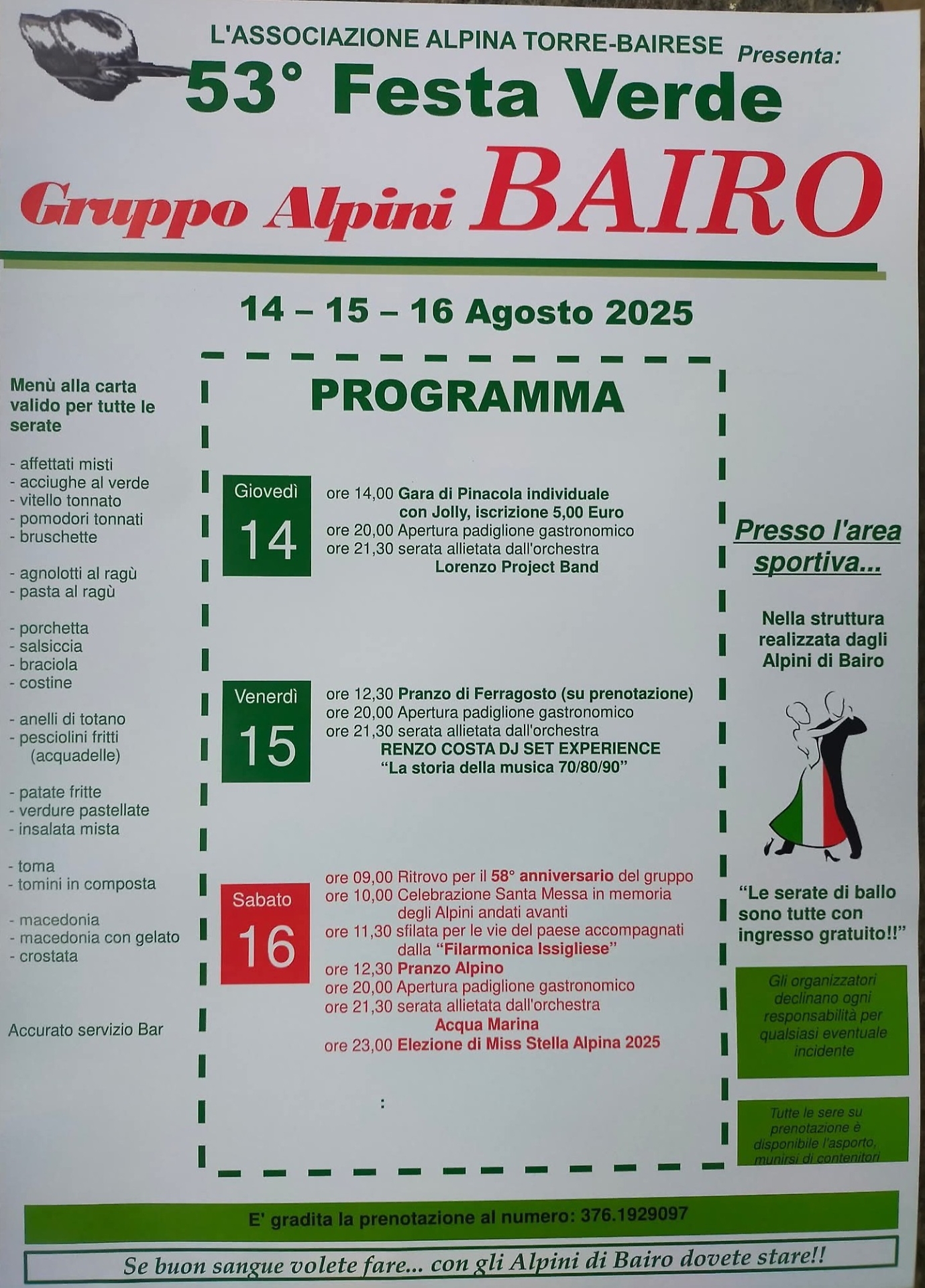 A Bairo, il Ferragosto non è mai una semplice data sul calendario, ma una festa di comunità, tradizione e condivisione. Anche quest’anno, l’Associazione Alpina Torre Bairese dà appuntamento a residenti e visitatori per la 53ª edizione della “Festa Verde”, uno degli eventi estivi più amati dell’Alto Canavese, che si svolgerà dal 14 al 16 agosto nell’area sportiva del paese, all’interno della struttura realizzata proprio dagli alpini.