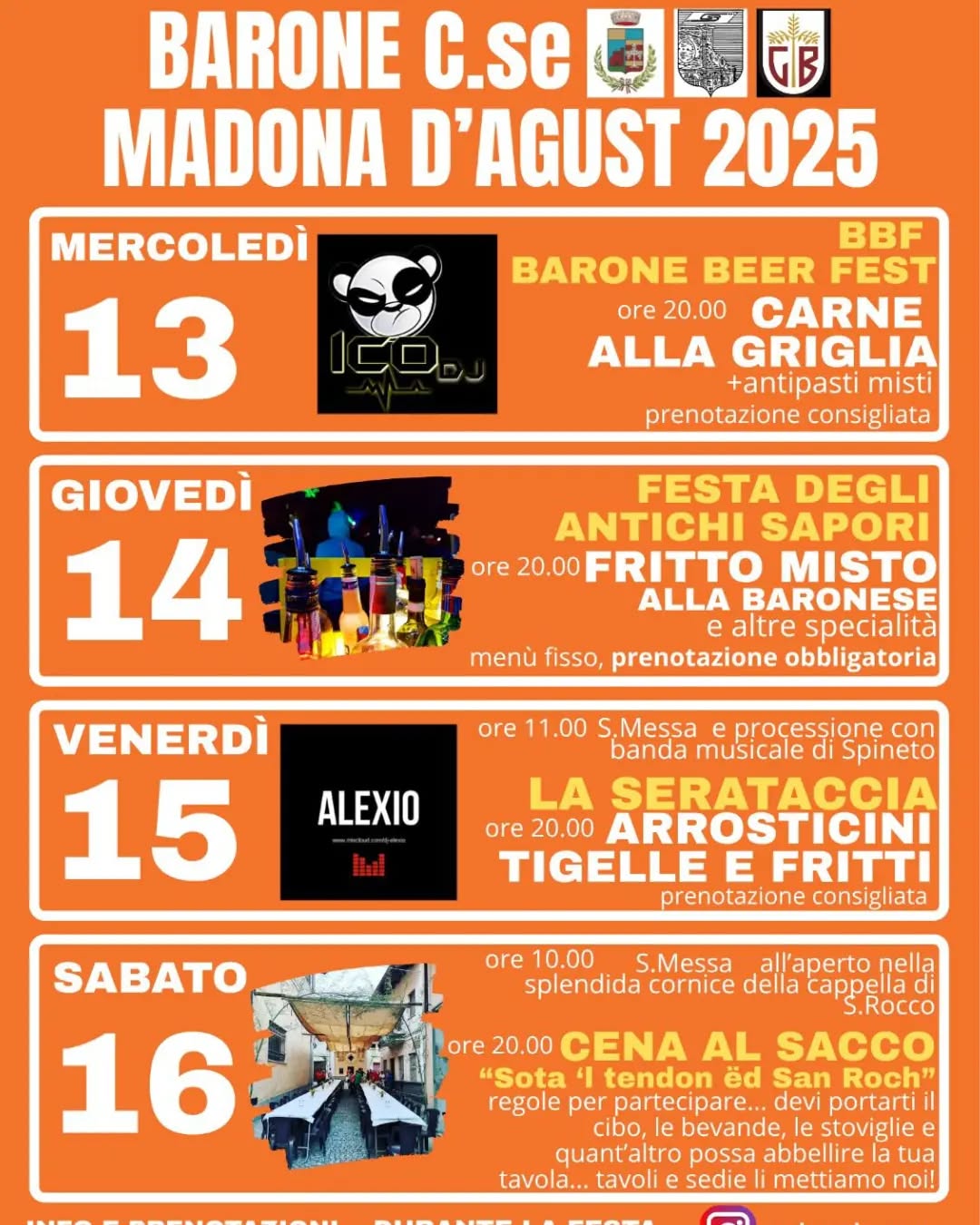 La Madona d’August di Barone C.se non è solo una sagra, ma un rito collettivo, una celebrazione popolare in cui fede e festa si fondono. Le serate sono pensate per tutte le età, dall’appassionato di cucina tipica al ballerino instancabile, passando per chi cerca semplicemente un momento di allegria da condividere.