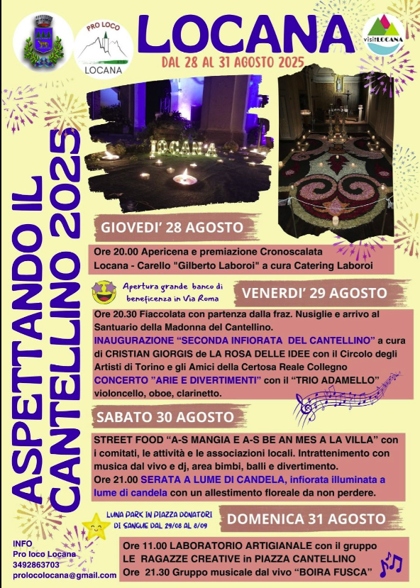 Un calendario che unisce fede, arte, tradizione e comunità, in grado di attrarre visitatori da tutto il Canavese e oltre. “Aspettando il Cantellino” non è solo una festa, ma un’esperienza condivisa, un percorso tra emozioni e bellezza che rinnova il legame profondo tra Locana e il suo Santuario.
