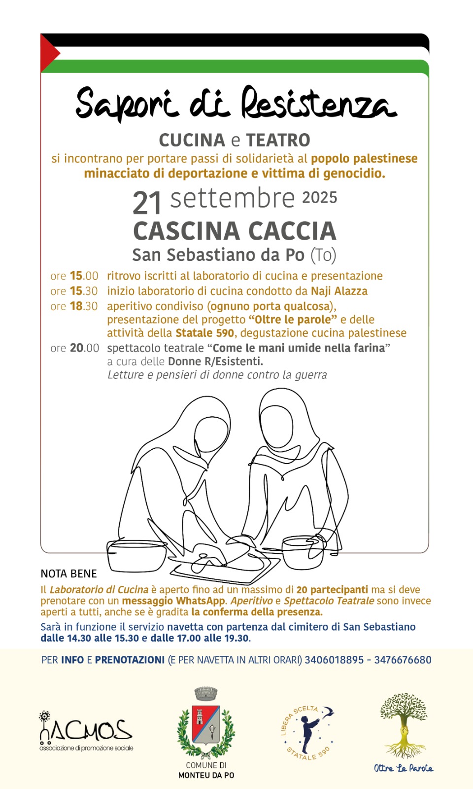 Cucina, teatro e solidarietà. Il 21 settembre la Cascina Caccia di San Sebastiano da Po diventa il cuore di un evento che unisce gusto e impegno civile: “Sapori di Resistenza”. Una giornata organizzata dal collettivo Statale 590, con il patrocinio del Comune di Monteu da Po e la collaborazione dell’associazione Acmos, di Libera e del progetto Oltre le Parole, per portare sostegno concreto e visibile al popolo palestinese, minacciato di deportazione e vittima di genocidio.