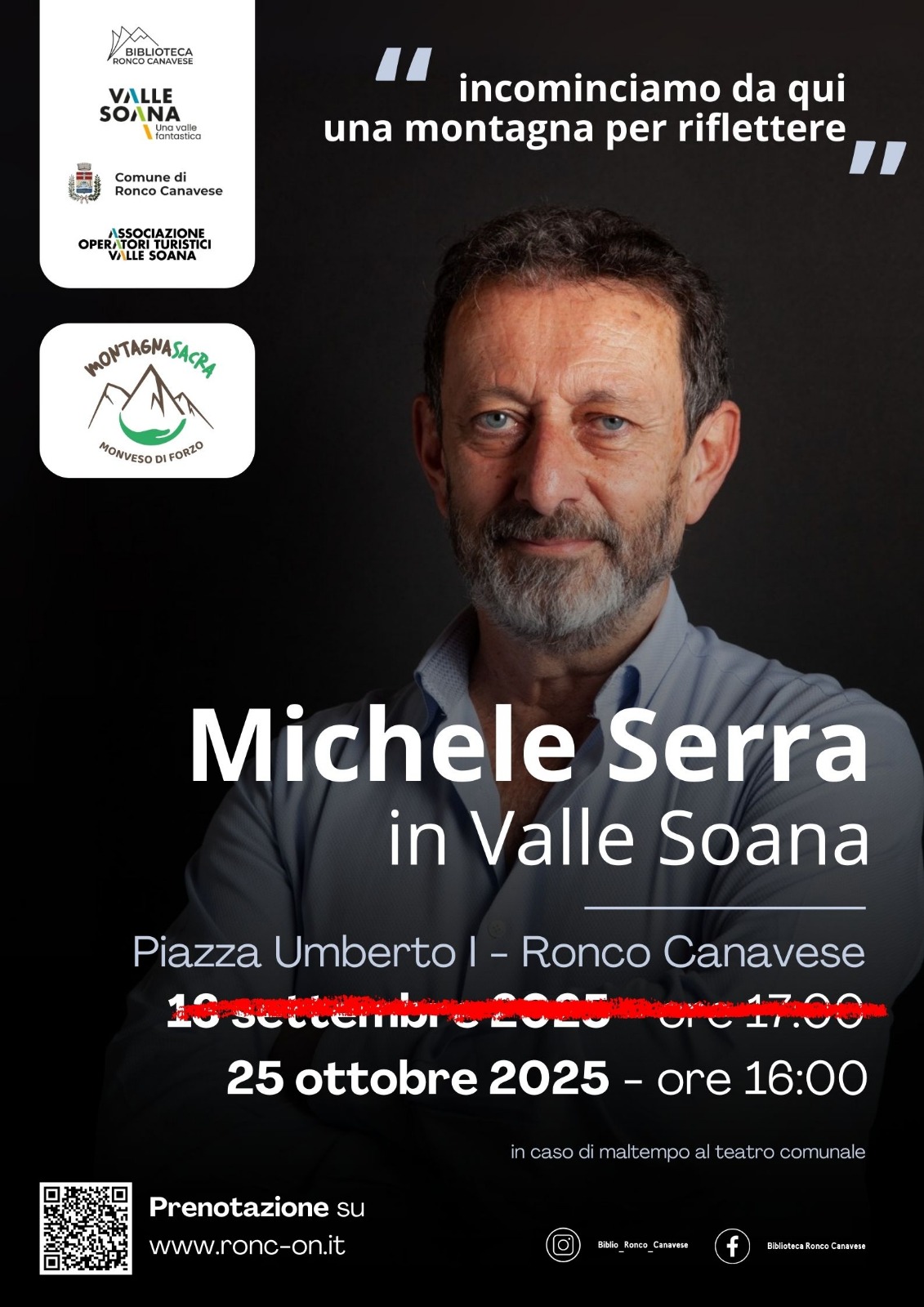 Cambio di data per l’atteso incontro con Michele Serra a Ronco Canavese. L’evento, inserito nel progetto Montagna Sacra e originariamente previsto per il 13 ottobre 2025, è stato rinviato a causa della temporanea indisponibilità dell’ospite.