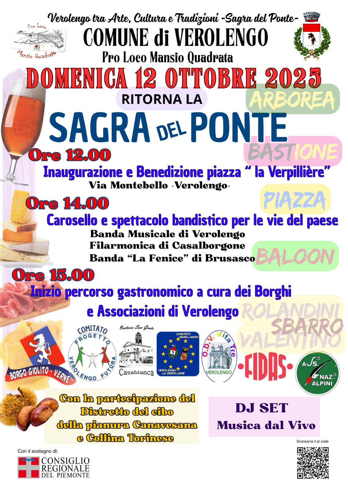 Verolengo si veste di festa. Domenica 12 ottobre torna la Sagra del Ponte, appuntamento che da decenni accompagna l’autunno del paese canavesano e che quest’anno promette di unire ancora una volta storia, comunità e buon cibo. A organizzare l’evento è la Pro Loco Mansio Quadrata con il sostegno del Comune e la partecipazione delle associazioni locali, pronte a riempire strade e piazze di musica e sapori.