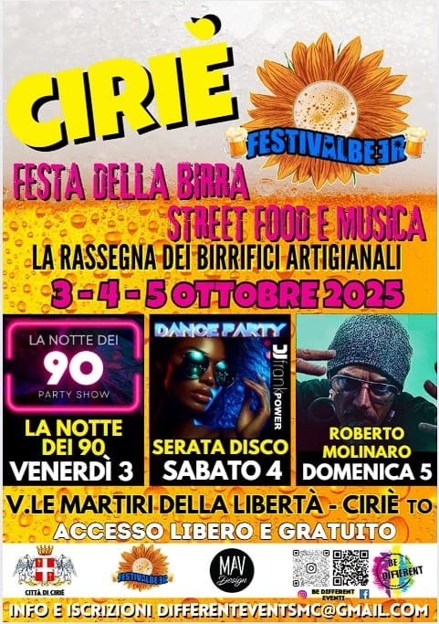 Il prossimo fine settimana Cirié tornerà a riempirsi di profumi, suoni e colori con il Festivalbeer, la manifestazione dedicata alla birra artigianale e allo street food che ogni anno richiama centinaia di persone. L’evento, organizzato da Be Different Eventi con il patrocinio della Città di Cirié, si svolgerà da venerdì 3 a domenica 5 ottobre lungo il viale di corso Martiri della Libertà e proporrà un calendario ricco di appuntamenti pensati per tutte le età.
