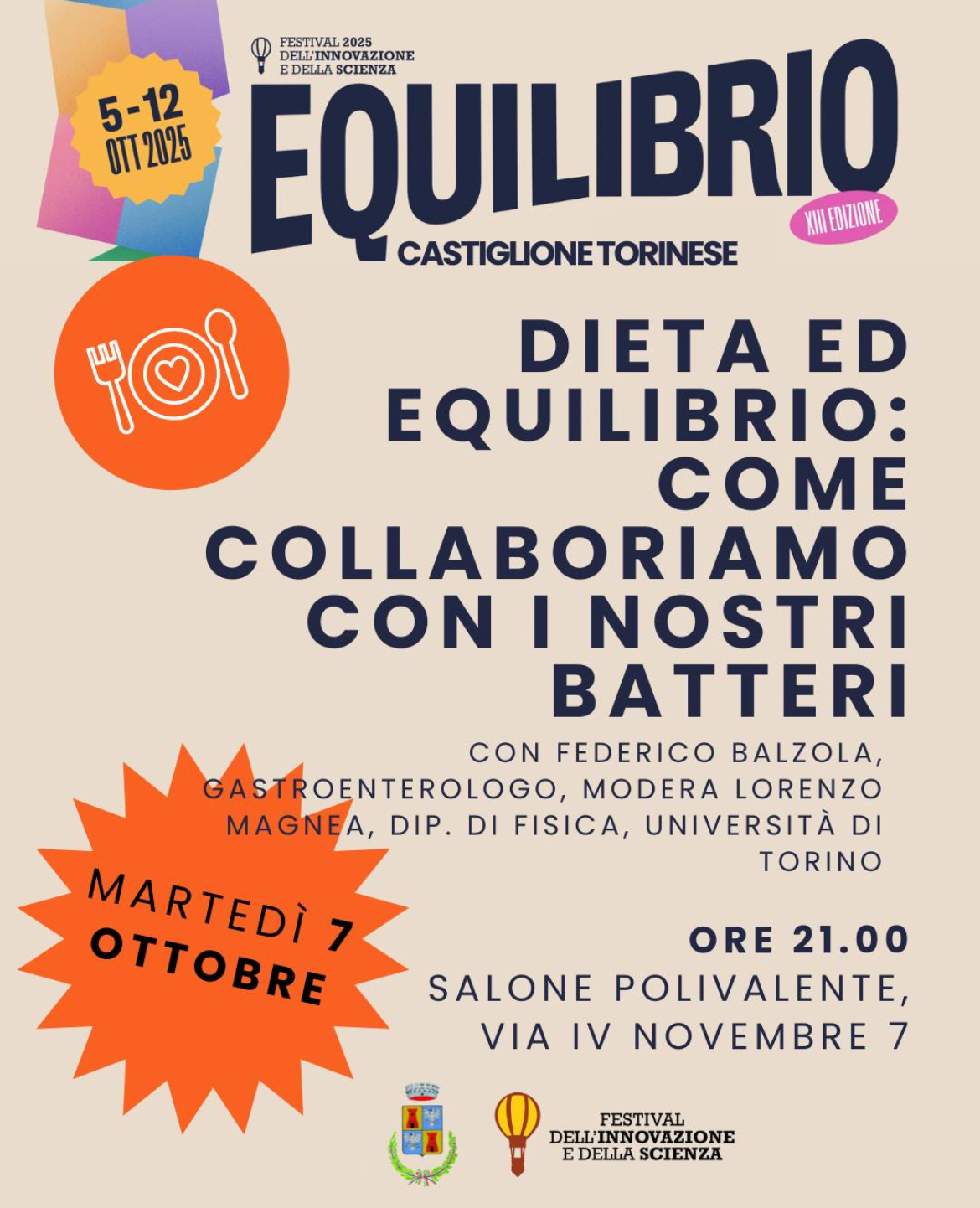 Cosa accade dentro di noi quando mangiamo? E perché il nostro corpo dipende dall’equilibrio di miliardi di batteri? Martedì 7 ottobre, alle 21, il Salone Polivalente di via IV Novembre 7, a Castiglione Torinese, ospiterà uno degli appuntamenti più attesi del Festival dell’Innovazione e della Scienza 2025: “Dieta ed equilibrio: come collaboriamo con i nostri batteri”.