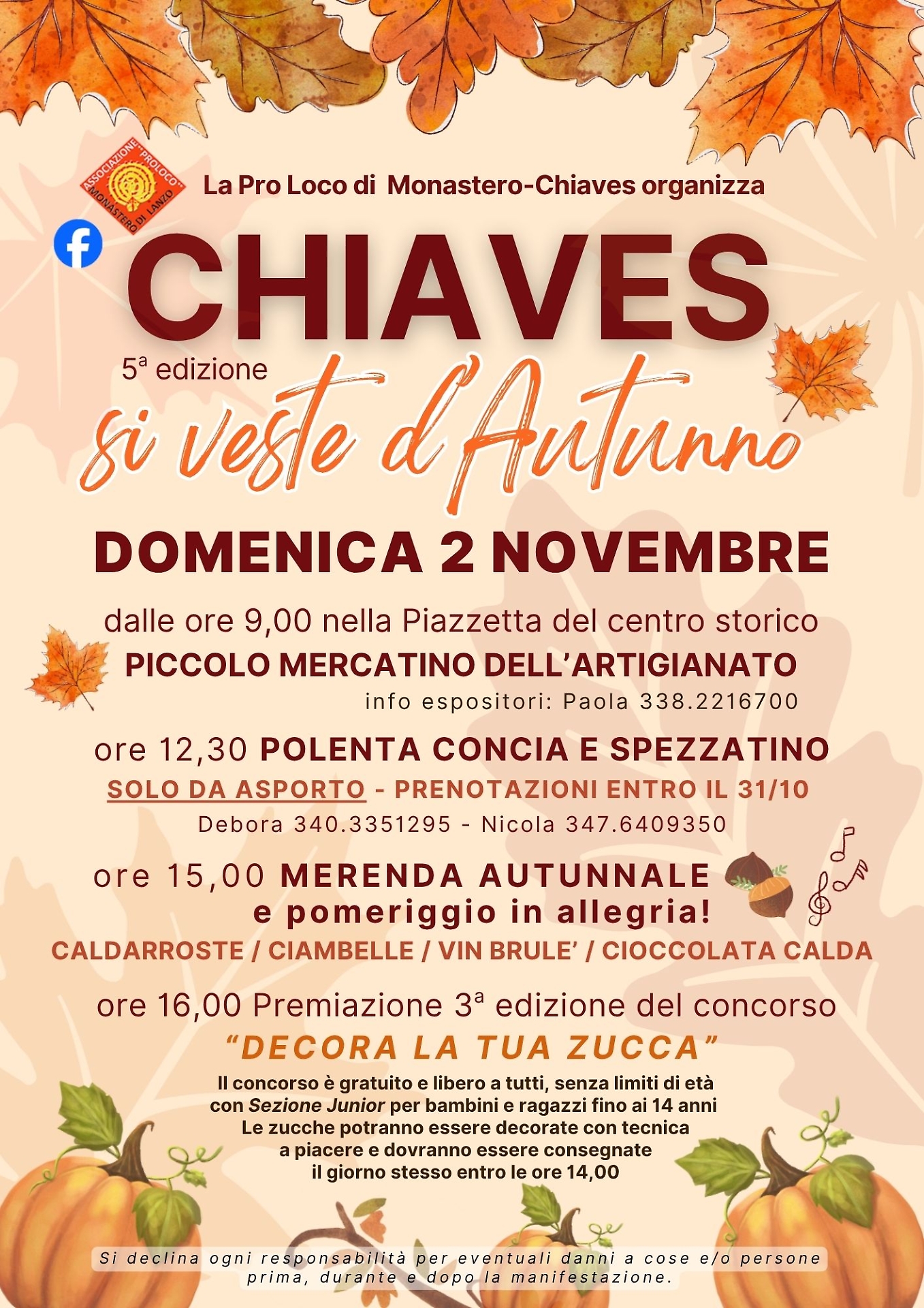 Con i suoi profumi, i sapori genuini e l’atmosfera festosa, “Chiaves si veste d’Autunno” vi aspetta e sarà un appuntamento imperdibile per salutare la stagione autunnale in compagnia. Maggiori informazioni sono disponibili sulla pagina Facebook della Pro Loco di Monastero di Lanzo-Chiaves.
