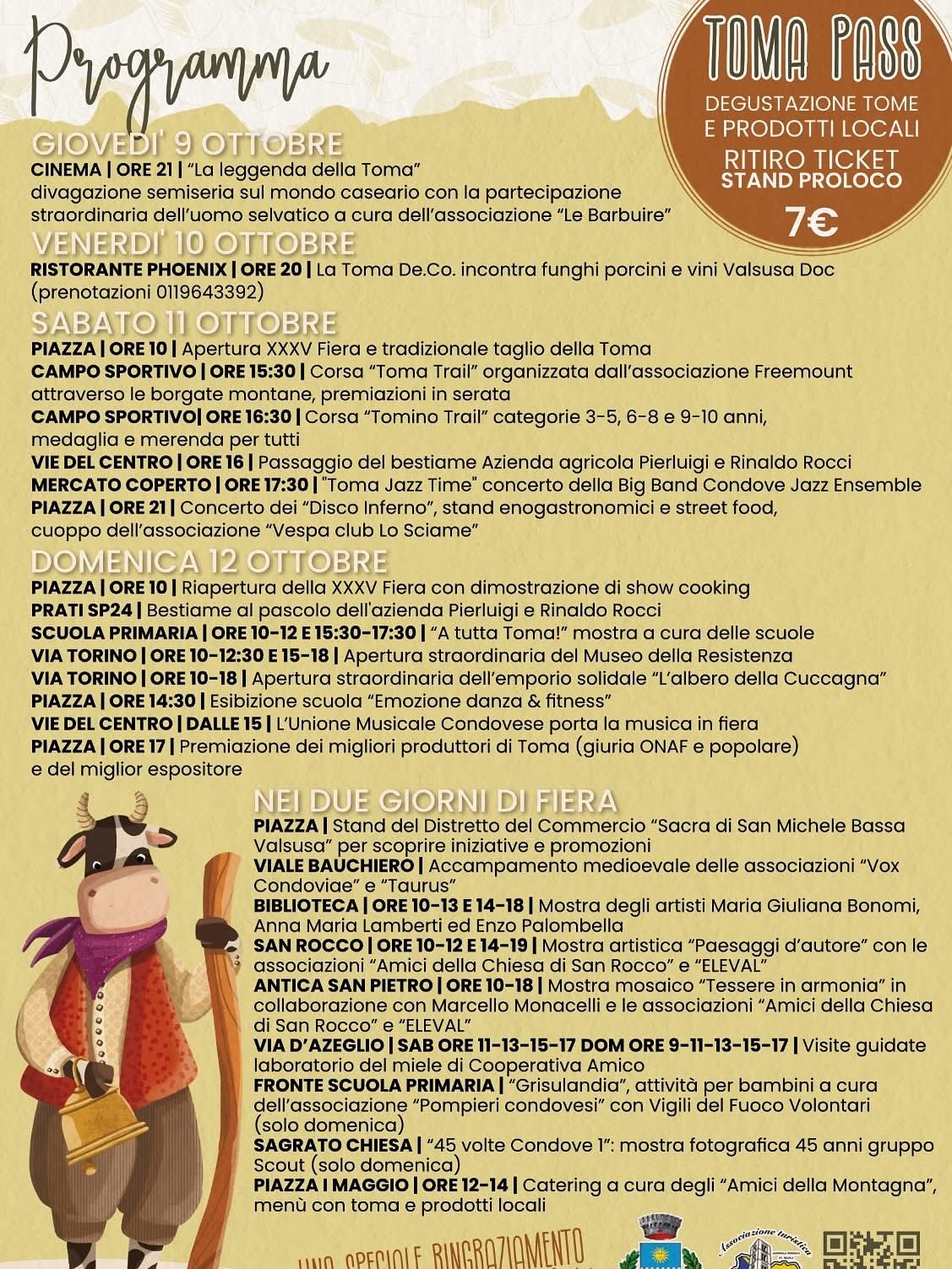 La festa si apre giovedì 9 ottobre con “La leggenda della Toma”, spettacolo semiserio al cinema del paese curato dall’associazione Le Barbuire, che vedrà la comparsa di un misterioso Uomo selvatico. Venerdì 10 ottobre la Toma si sposa con i porcini e i vini Doc della Valsusa in una cena speciale al ristorante Phoenix. Da sabato 11 si entra nel vivo: alle 10 il taglio della forma inaugura ufficialmente la Fiera, mentre nel pomeriggio la corsa Toma Trail attraversa le borgate con partenza dal campo sportivo alle 15,30, seguita dal Tomino Trail per i bambini. Alle 16 la transumanza porta i bovini dell’azienda Rocci tra le vie del centro, offrendo uno spettacolo che lega ancora oggi la comunità al ritmo della montagna. Il sabato si chiude tra concerti e spettacoli: alle 17,30 la big band Condove Jazz Ensemble suona al mercato coperto, in serata tocca ai Disco Inferno, con stand gastronomici, street food e il raduno del Vespa Club “Lo Sciame”.