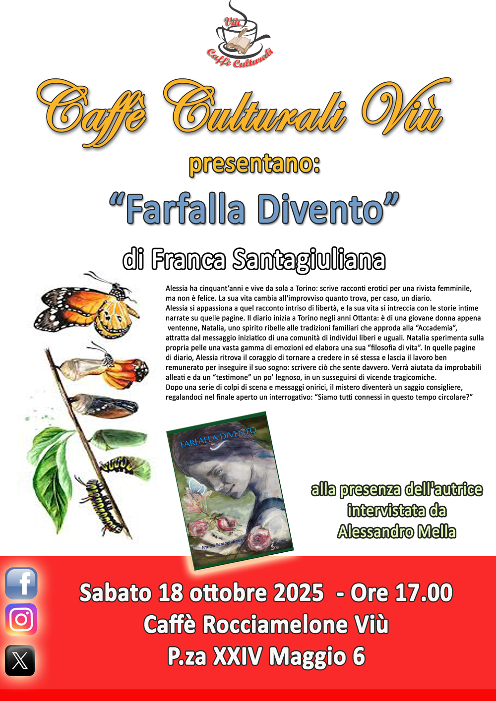 Con l’autunno torna a Viù l’appuntamento con i Caffè Culturali, la rassegna che da anni propone al pubblico un alternarsi di incontri dedicati alla saggistica e alla narrativa. Sabato 18 ottobre, alle ore 17, sarà il Caffè Rocciamelone, storica sede delle presentazioni, ad accogliere il nuovo incontro. Protagonista sarà Franca Santagiuliana con il volume di recentissima pubblicazione “Farfalla Divento”.