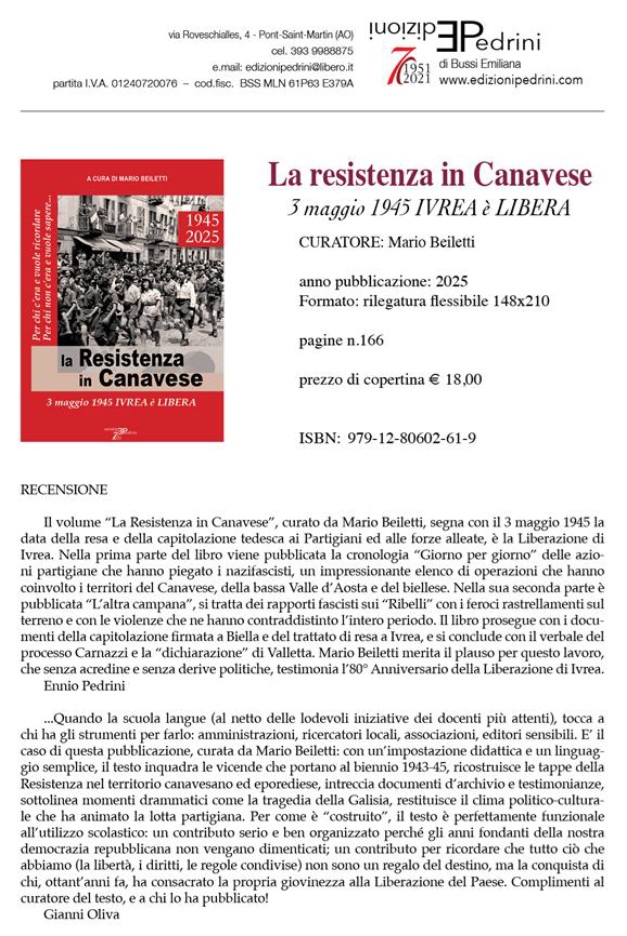 Insieme all’autore interverranno Ennio Pedrini, editore e promotore del volume, e Marilena Padrotti, presidente della sezione Anpi di Caluso e componente della Presidenza provinciale di Torino. Il dialogo si concentrerà sulle vicende locali della lotta di Liberazione nel Canavese, un territorio che fu crocevia di coraggio, sofferenza e solidarietà. Le valli, i paesi, i monti e le pianure canavesane furono infatti scenario di azioni partigiane decisive, ma anche di gravi rappresaglie nazifasciste, il cui ricordo continua a segnare la coscienza collettiva.