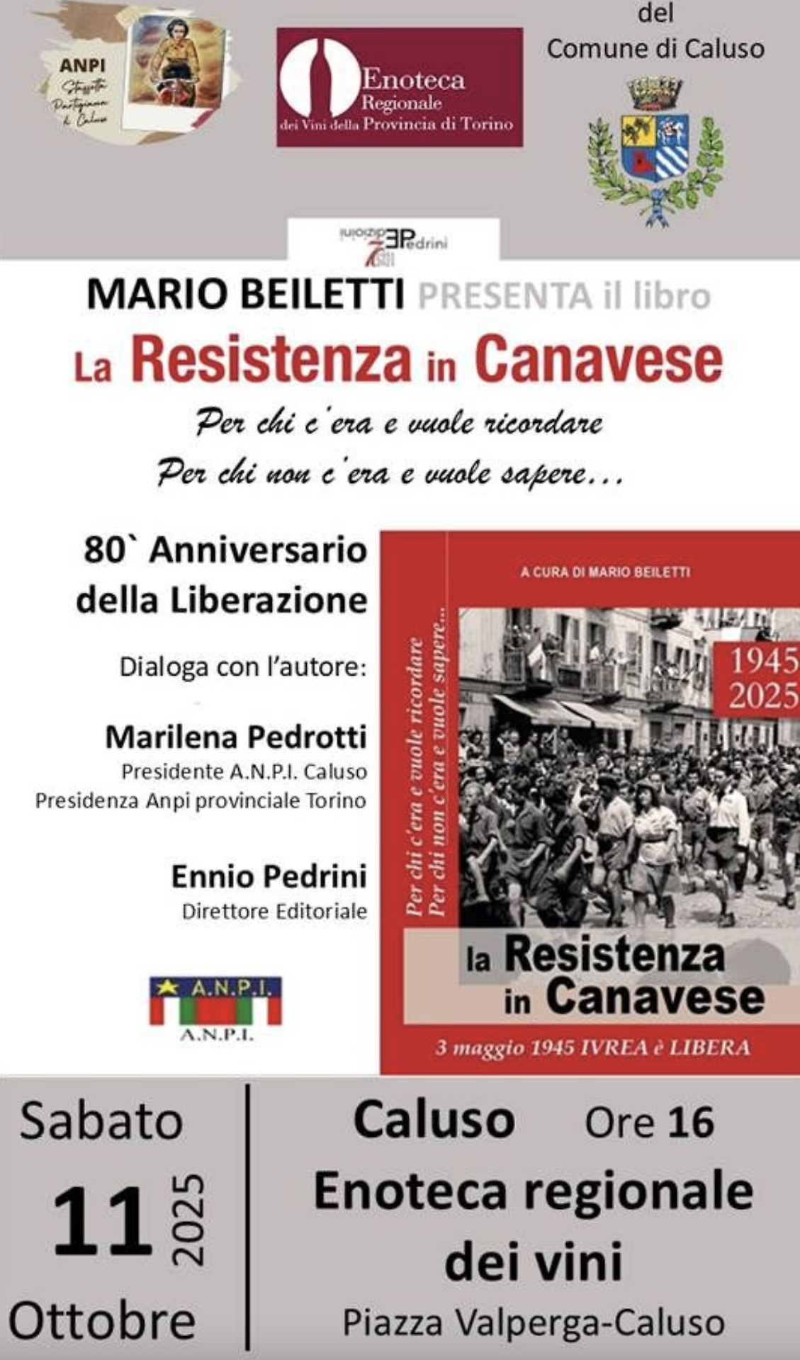 Un nuovo appuntamento con la memoria, questa volta a Caluso. Sabato 11 ottobre 2025, alle ore 16, presso l’Enoteca Regionale dei vini di piazza Valperga, si terrà la presentazione del libro “La Resistenza in Canavese”, edito da Pedrini e curato da Mario Beiletti. L’incontro rientra nel ciclo di appuntamenti culturali dedicati al ricordo del movimento partigiano piemontese e al suo ruolo nella nascita della Repubblica.