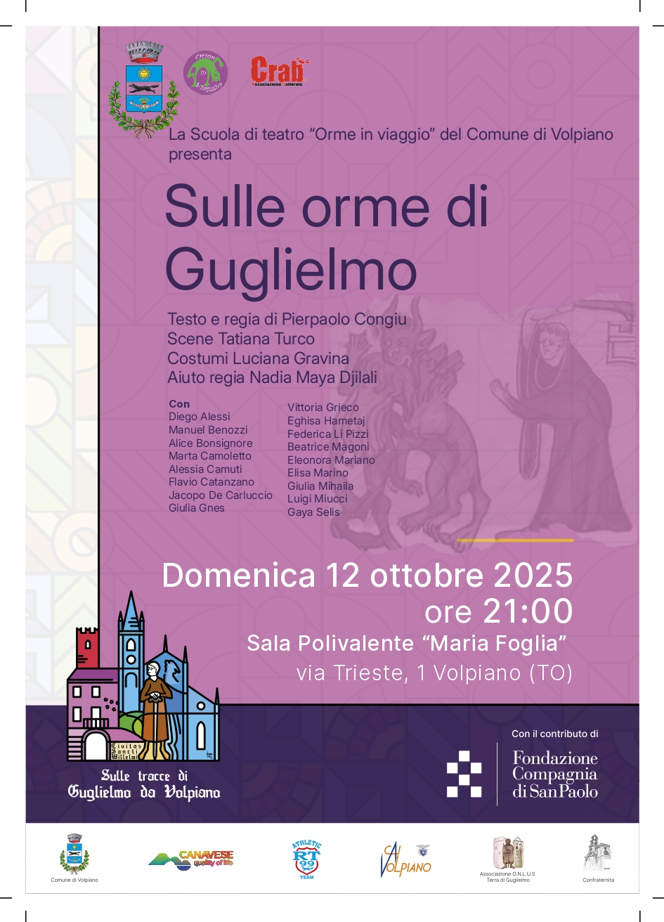 Barbara Sapino, Assessora alla Cultura del Comune di Volpiano, ha commentato il progetto: “Il Laboratorio Permanente di Teatro è da anni un fiore all’occhiello della nostra offerta culturale. Quest’anno, i ragazzi di Orme in Viaggio si sono misurati con una sfida entusiasmante: portare sul palco la storia di Guglielmo da Volpiano. Hanno visitato l’Abbazia di Fruttuaria di San Benigno Canavese, studiato la sua vita, costruito le scenografie con le proprie mani. È un percorso che ha unito conoscenza, creatività e senso di appartenenza. Il teatro, in questo caso, diventa un ponte: unisce le generazioni e restituisce vita alla memoria del nostro territorio”.