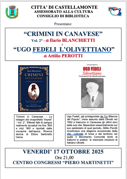 Una serata di cultura, memoria e identità. Venerdì 17 ottobre, alle ore 21, il Centro Congressi “Piero Martinetti” di Castellamonte ospiterà un doppio appuntamento letterario promosso dall’Assessorato alla Cultura e dal Consiglio di Biblioteca. Due autori, due opere, un unico filo conduttore: il legame profondo tra il Canavese e la sua storia.