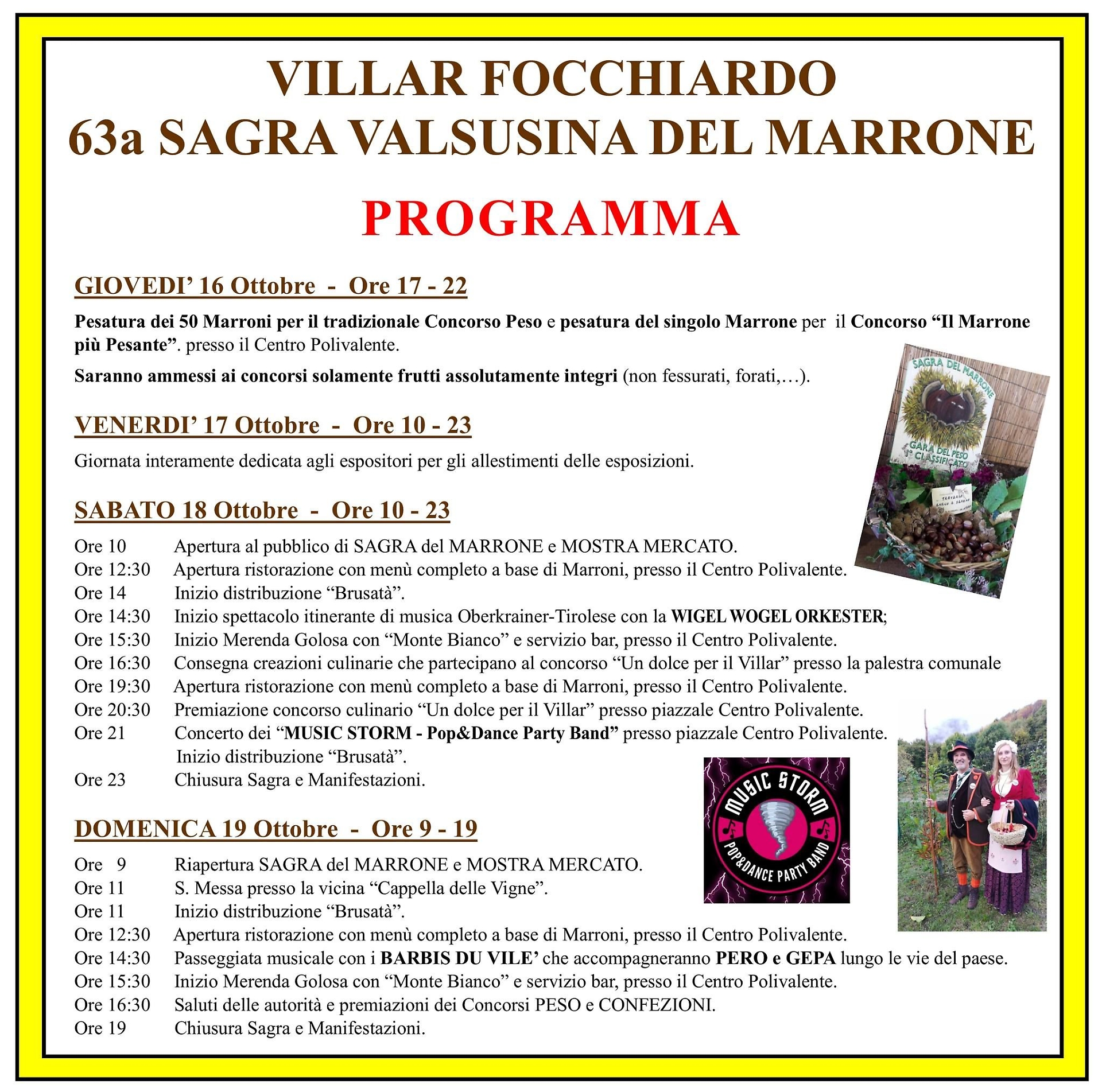 Nel cuore dell’autunno, quando i castagneti valsusini si accendono di colori e profumi, Villar Focchiardo si prepara ad accogliere una nuova edizione della sua festa più attesa: la Sagra Valsusina del Marrone, la più antica d’Italia dedicata a questo frutto prezioso. Giunta quest’anno alla 63ª edizione, la manifestazione si terrà da giovedì 16 a domenica 19 ottobre, come da tradizione nella terza domenica del mese, ed è patrocinata dalla Città metropolitana di Torino, all’interno del circuito GustoValsusa.